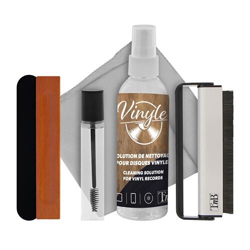 Kit de nettoyage 5 en 1 pour disques et platines vinyles, Nettoyer avec précision le diamant des platines vinyles, Comprend : 1 brosse en velours - 1 brosse en fibres de carbone antistatiques - 1 liquide de nettoyage 100 ml, 1 tissu microfibre - 1 applicateur mascara brosse + fluide 20ml