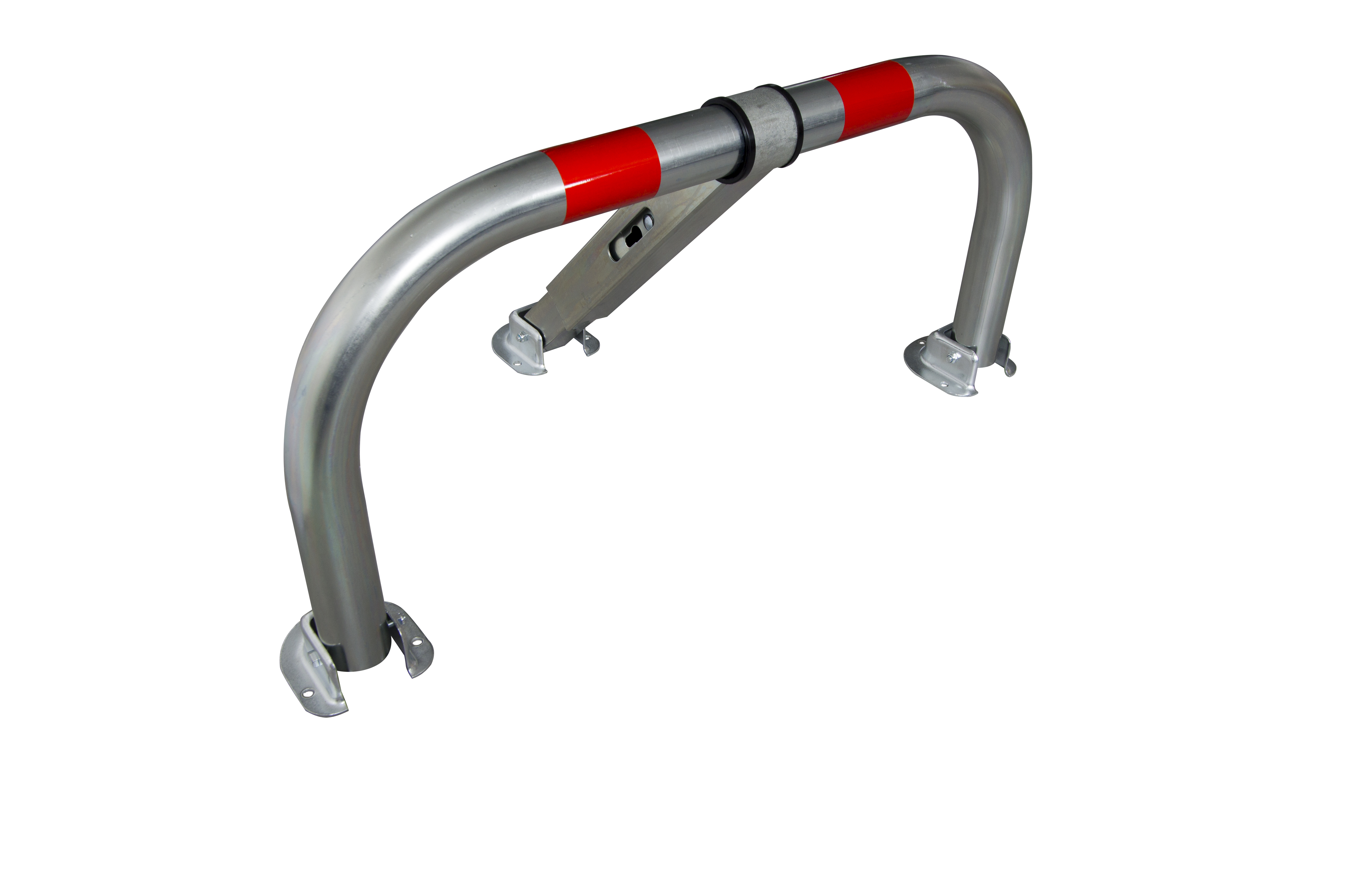 Arceau de parking permettant de réserver une place de stationnement 2 bagues anti-frottement et 2 bandes réfléchissantes rouge de classe 1 Serrure clés différentes Fixations béton incluses Pieds en acier zingué