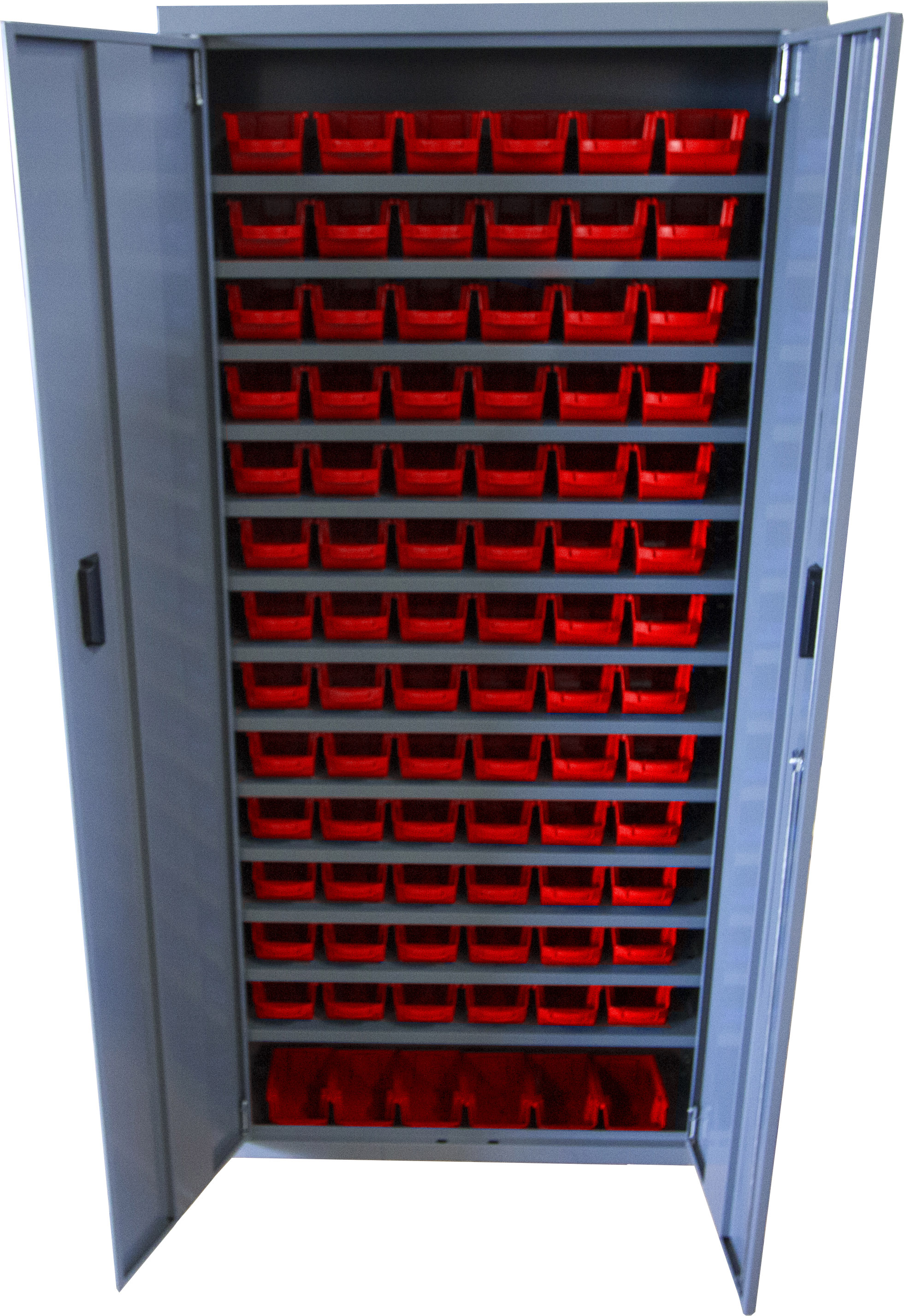 Description détailléeArmoire avec structure et portes en acierLivrée prête à être montéeEquipée de 84 bacs de rangement capacité 1L couleur rouge (SPACY2R)Supporte 20kg par tablette