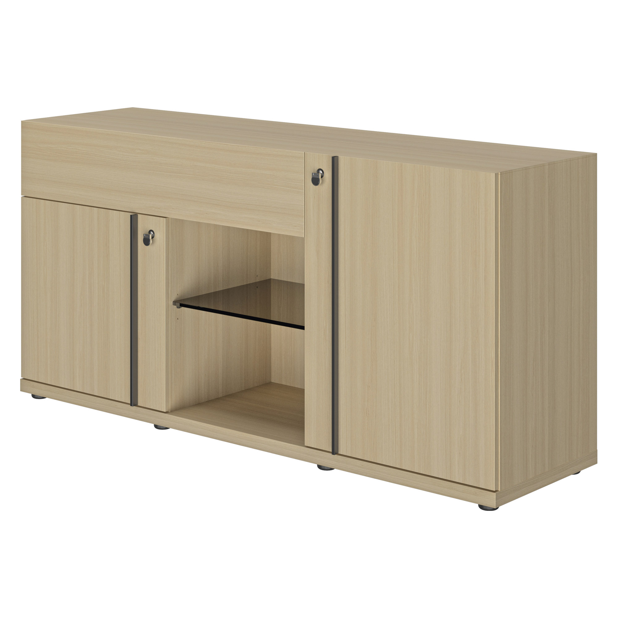 Description détailléeApporter une touche de déco avec la crédence Onyx.Composition: Structure mélaminé chêne structuré et veiné1 tiroir, 1 porte (1 étagère intérieure) 1 porte (1 étagère intérieure) Dimensions : H 78 x L 160 x P 45 cm.Accessoires en option: Top en verre teinté gris épaisseur 10 mm en option (ref 772066)Montage: Livré démonté, montage en option.Fabrication française