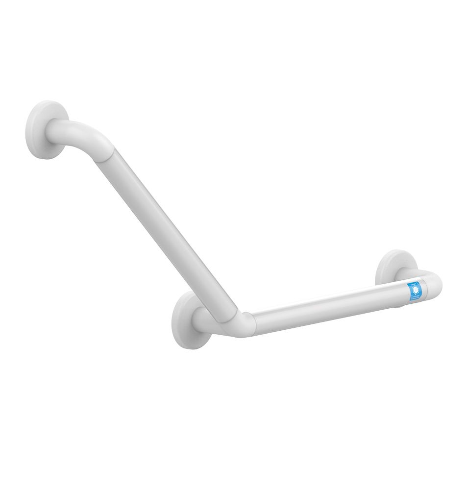 Cette barre de relèvement pour WC est adaptée aux PMR (personne à mobilité réduite) et a les caractéristiques suivantes : - un angle de 135° et 3 points de fixation - une longueur de 400 x 400 mm et un diamètre de 32 mm - matière en inox 304 brossé ou époxy blanc - livrée avec rosaces de finition à clipser Compris toutes suggestions de fournitures et de mise en ½uvre. Cette barre d'appui coudée dispose d'un film virucide transparent COVERSAFE T aux nombreux avantages : -1h : destruction de 96% du CORONAVIRUS SARS-CoV-2-24h : destruction de 99,9% des virus et bactéries* -4 ans : efficacité testée et validée du film virucide-Technologie naturelle PYLOTE : sans aucun danger pour la peau, usage en toute sécurité. Testée et validée par des laboratoires certifiés. -Discret : film transparent, aspect mat, retrait sans trace en cas de besoin, et remplacement de film possible -Facilité d'entretien : compatible avec les produits ménagers usuels (savon, gel, désinfectant). Sans dégradation de l'activité anti-microbienne, efficacité continue> Dimensions : Diamètre : 32 mmLongueur : 400 x 400 mmDistance entre le mur et l'axe de la barre : 50 mm +/- 5 mm> Matière et couleur de finition :Tube acier / acier inox 304Platine de fixation inox 304 soudée (version inox) ou vissées (version blanc)Finition inox brossé / peinture epoxy blanc RAL 9003> Livré avec :Rosaces en acier inox 304 permettant de dissimuler les vis de fixation> Normes / Agréments :Résistance au brouillard salin neutre (NSS) : 200 h selon NF ISO 9227MONTAGE et MISE EN SERVICE Le système de fixation est à adapter en fonction du support.Les éléments de fixation fournis de manière non systématique peuvent ne pas être adaptés au support existant.Le support doit pouvoir supporter une charge de 200 kg et devra être renforcé si nécessaire.Hauteur de pose conseillée 750 mmNETTOYAGE Le revêtement des barres d'appui doit être nettoyé exclusivement à l'eau savonneuse.Proscrire les produits d'entretien abrasifs, acides, alcalins ou ammoniaquésCe que dit la loiChaque cabine d'essayage et sanitaire pour PMR doit disposer d'une barre d'appui permettant à l'utilisateur d'avoir un appui debout, de se baisser ou de se relever.Les barres d'appui doivent comporter une partie horizontale positionnée entre 0,70 et 0,80 m de hauteur.Elles doivent supporter le poids d'un homme. Les barres d'appui coudées doivent avoir un angle de 135°.Pour en savoir plus, consultez notre article sur l'aménagement des sanitaires pour PMR.