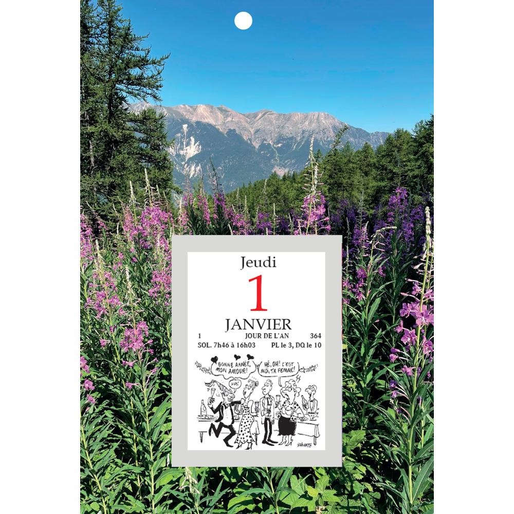 Date, saint du jour, numéro du jour et nombres de jours restants de l'année, heures de lever et coucher du soleil, phase de la lune.