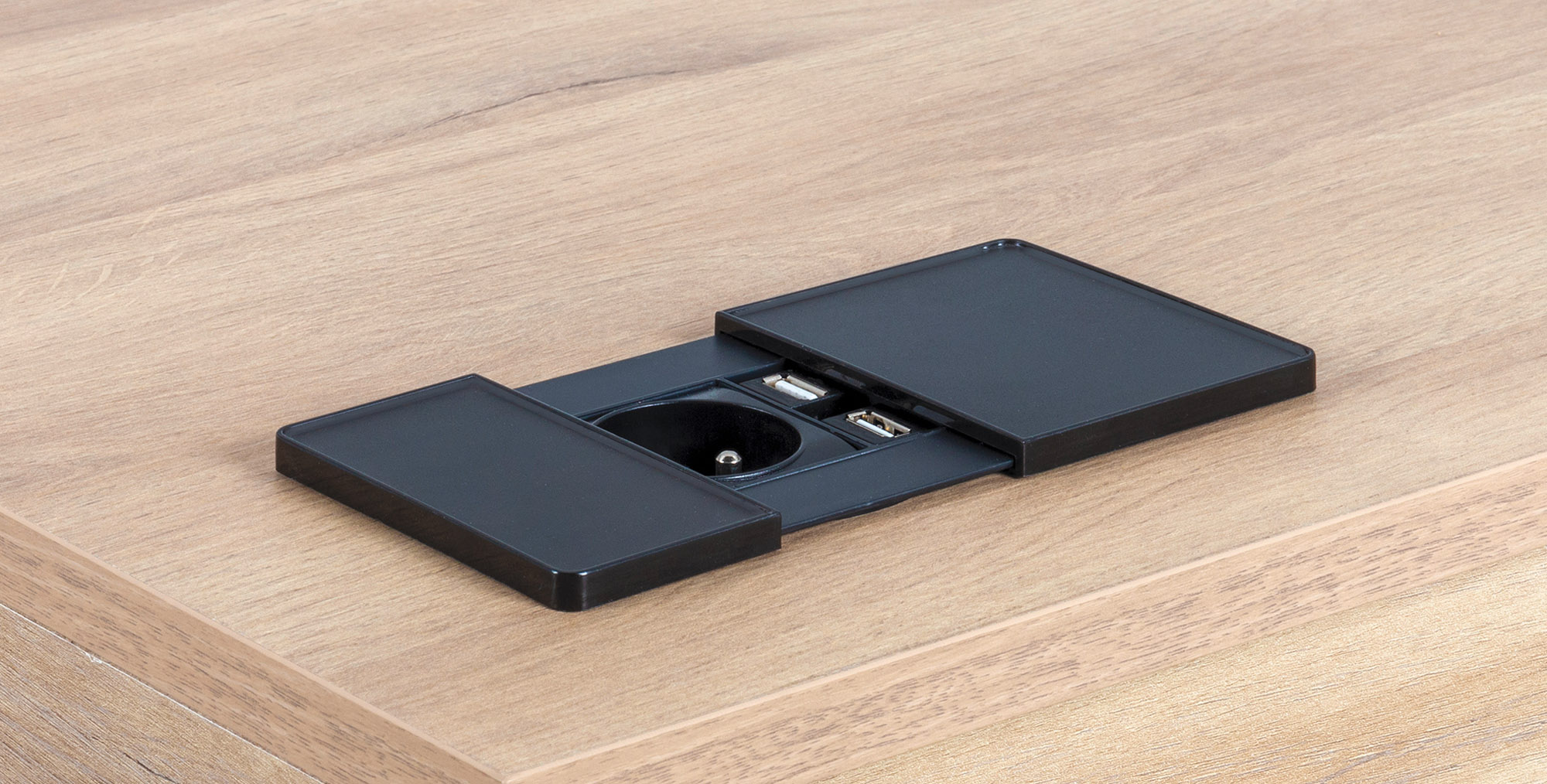1 grand et 1 petit capot pour protéger les prises. Système d'alimentation compact et polyvalent se fixant sur le plateau du bureau ONYX. Conçu pour tenir dans un trou de diamètre standard de 80 mm.