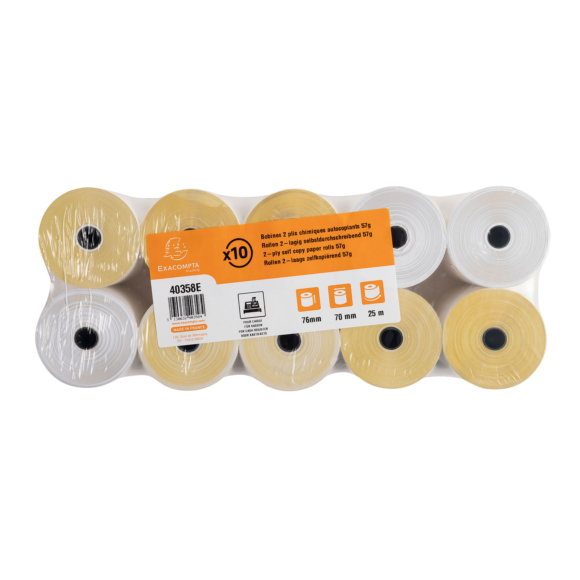 Format de la bobine : 76 mm de laize (largeur) et 70 mm de diamètre. Métrage (+ ou - 2m) : 25 m. Mandrin standard de 12 mm.