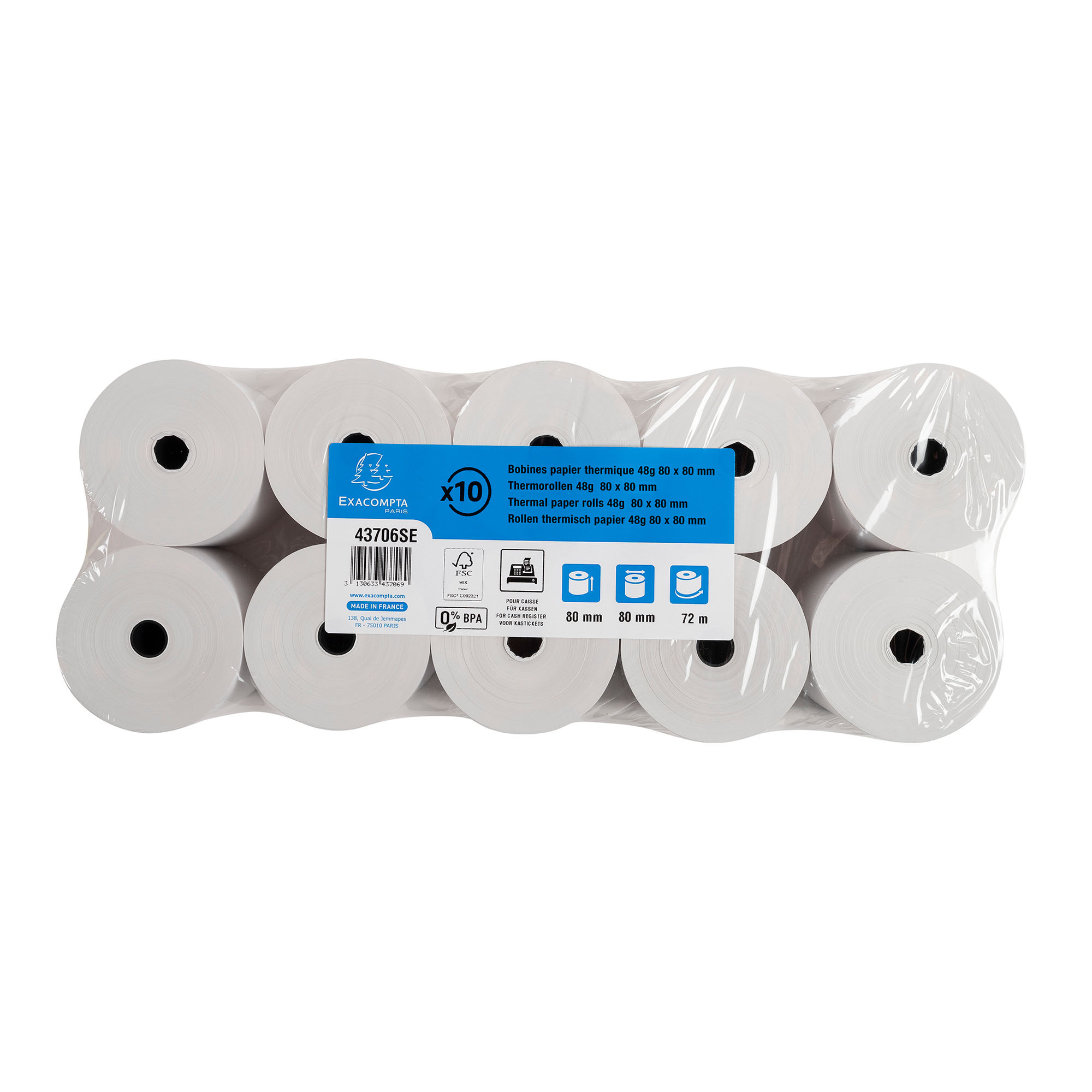 Paquet de 10. Format de la bobine : 80 mm de laize (largeur) et 70 mm de diamètre. Métrage (+ ou - 2m) : 72 m. Mandrin standard de 12 mm.