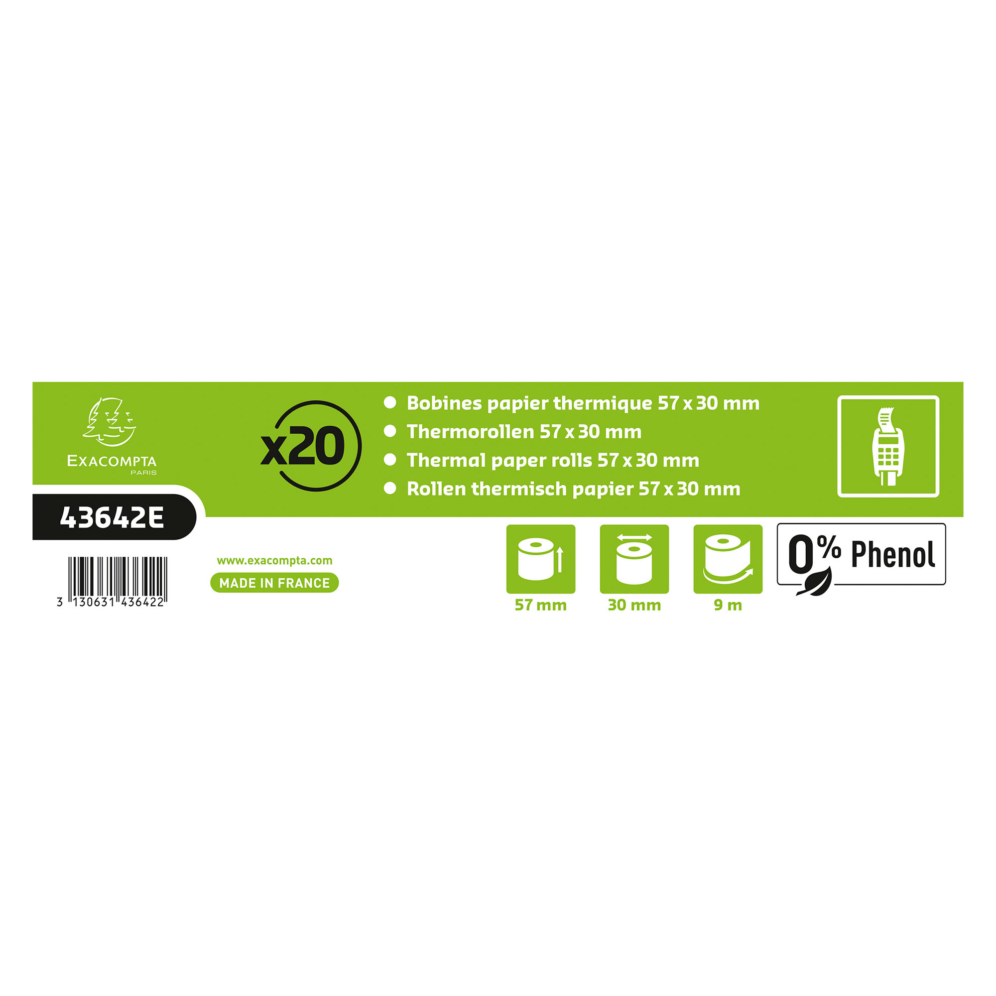 Convient à toute marque de terminal de carte bancaire. Papier garanti sans phénol, c'est-à-dire sans Bisphénol A, selon la réglementation Européenne qui interdit son usage à partir de janvier 2020, mais également sans bisphénol S.