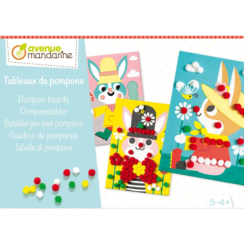 Kit créatif adapté aux plus petits pour confectionner de jolis tableaux pompons doux et colorés sur le thème des lapins.