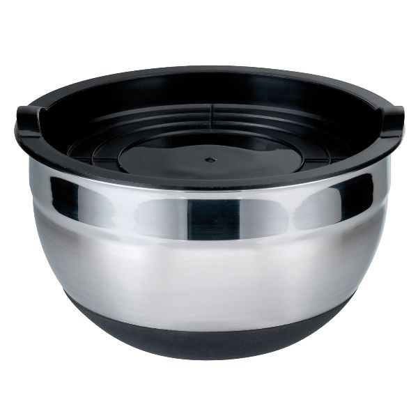 Bol pâtissier 20 cm + couvercle - Robuste, ce bol pâtissier en acier inoxydable vous sera très utile pour réaliser de nombreuses préparations ! - Grâce à sa base anti-dérapante revêtue de silicone, il ne bouge pas sur votre plan de travail pendant que vous l'utilisez et reste toujours bien en place y compris lorsque vous mélangez énergiquement vos préparations ! - Pratique, il est gradué à l'intérieur tous les 0.5 L jusqu'à 1.5 L - Vous pourrez l'utiliser pour monter des blancs en neige, préparer des pâtes à gâteau, réalisez des mayonnaises, battre des œufs en omelette .... - Vous pourrez également vous en servir de saladier ou de plat de service - Grâce au couvercle, vous pourrez conserver vos préparations plus longtemps : idéal pour les pâtes qui doivent reposer ou pour conserver vos préparations au réfrigérateur ! - Nettoyage facile : passe au lave-vaisselle.