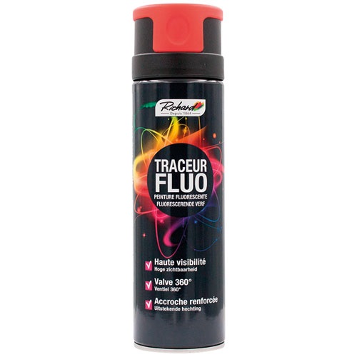 La bombe peinture fluorescente traceur fluo multi-supports de 500 mL en coloris orange de la marque RICHARD est une peinture acrylique solvantée fluorescente à séchage rapide et haute adhérence. Avec sa haute visibilité, cette peinture rend les surfaces traitées lumineuses et visibles à distance, même avec peu de lumière. Avec son excellent pouvoir couvrant, cette peinture ne jaunit pas et peut s'utiliser autant en intérieur qu'en extérieur sur des supports en métal, plastique, bois, verre, céramique, enduit, carton. Possède une valve 360° pour une plus grande facilité d'application. Très faibles émissions dans l'air. Bien agité jusqu'à entendre la bille circulée aisément. Tenir la bombe droite à 25 cm de la zone à peindre. La surface doit être propre, sèche et dégraissée. Pulvériser en couches fines, multiples et croisées.