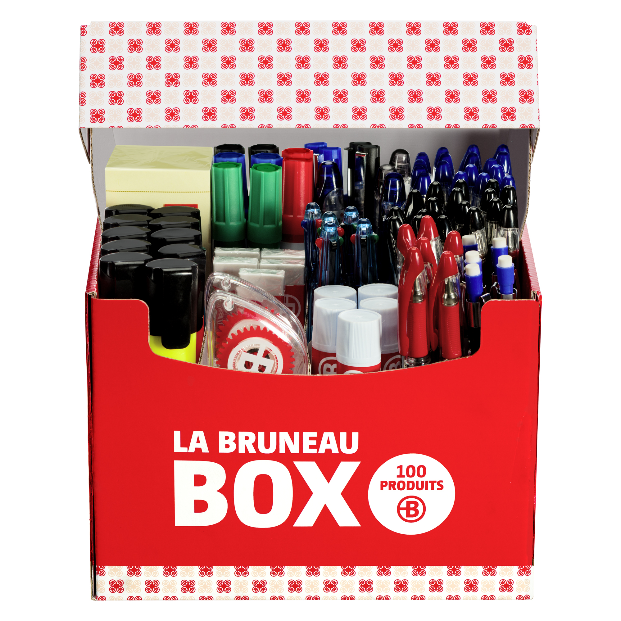Description détailléeRetrouvez dans cette Box les indispensables du bureau à la marque Bruneau !100 produits essentiels pour équiper vos salariés avec des produits de qualité à un prix jusqu'à 30% moins cher que la marque nationale équivalente.Pack composé de :40 stylos bille à capuchon (17 bleus, 17 noirs, 6 rouges)12 notes repositionnables (40 x 50 mm)10 surligneurs (2 bleus, 3 jaunes, 2 oranges, 2 roses, 1 vert)5 bâtons de colle (10 g)5 gommes5 portes-mines 0,7 mm5 stylos 4 couleurs4 stylos feutres (2 bleus, 2 noirs)4 marqueurs effaçables (1 bleu, 1 noir, 1 rouge, 1 vert)4 marqueurs permanents (1 bleu, 1 noir, 1 rouge, 1 vert)4 stylos roller (2 bleus, 2 noirs)2 correcteurs à sec (longueur 8 mètres).