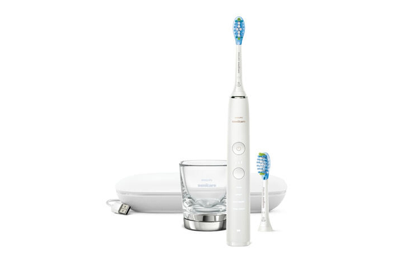 Brosse à dents connectée - Rechargeable - Technologie sonique, 4 modes de brossage - 3 réglages d'intensité - Capteur de pression et technologie BrushSync, Suivi de brossage personnalisé grâce à l'application Philips Sonicare, Inclus : 2 têtes de brosses - Verre de charge - Coffret de voyage USB - Socle de charge voyage