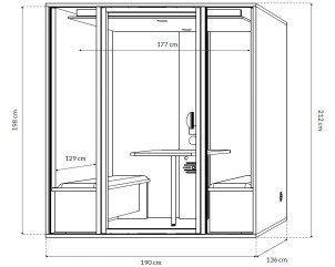2 banquettes intégrées (L 88 × P 38 × H 45 cm) et tablette fonctionnelle (P 43 × L 79 × H 105 cm) pour un confort optimal lors des sessions de travail ou de visio.