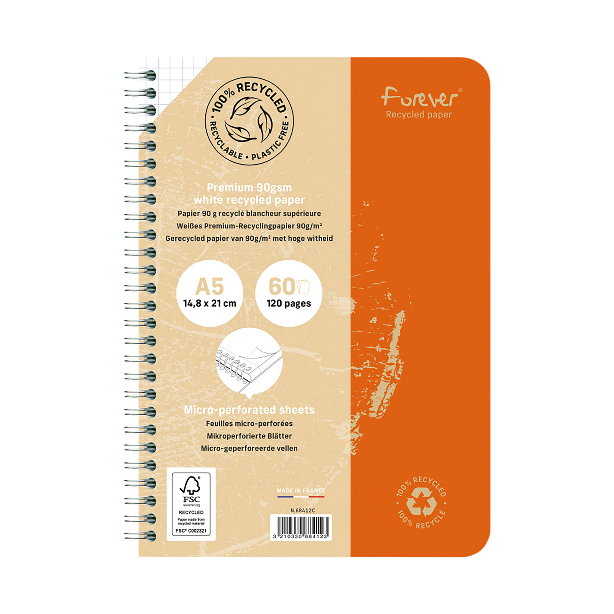 Ce cahier Forever affiche fièrement sa certification FSC Recyclé car il est entièrement fabriqué à partir de vieux papiers et son papier Premium recyclé est sans désencrage ni traitement au chlore.