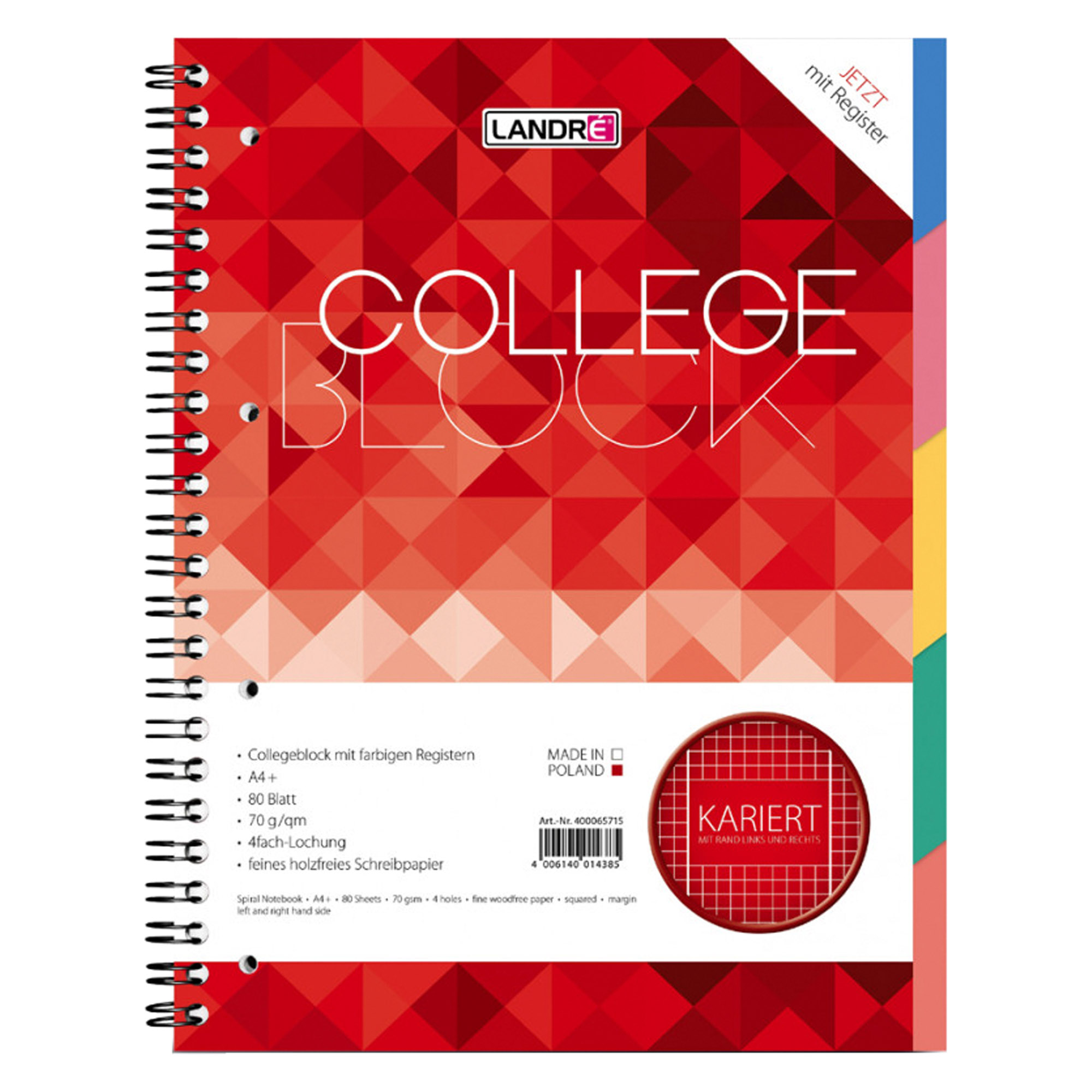 Optez pour le cahier à spirale avec intercalaires 'COLLEGE', A4, de la marque """" pour organiser efficacement vos notes et documents professionnels. Ce cahier de haute qualité dispose de 160 pages quadrillées et d'un grammage de 70 g/m2, offrant une excellente base pour l'écriture et le dessin.