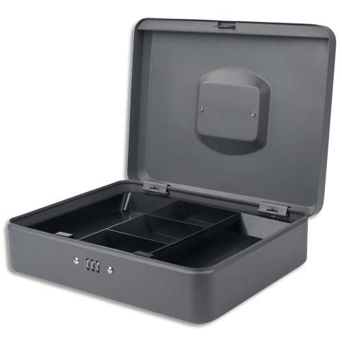Description détailléeCaisse à monnaie à code Pavo 30 cm.En tôle d'acier, métal 0,8 mm d'épaisseurFinition peinture époxy (anti-traces)Plateau intérieur amovible 5 compartimentsPoignée de transport en métal et encastréeCode de sécurité à 3 chiffresColoris GrisDimensions (l x h x p) : 30 x 9 x 24 cmPoids : 1,69 kg