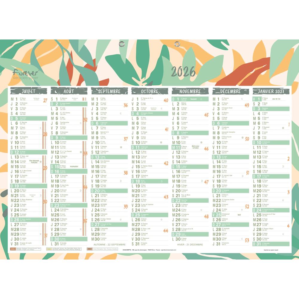 Avec l'indication des vacances scolaires, les dimanches et les jours fériés sont imprimés en couleur pour les repérer facilement, de la place pour écrire sur chaque jour. Recto 7 mois : janvier - juillet. Verso 7 mois : juillet - janvier.