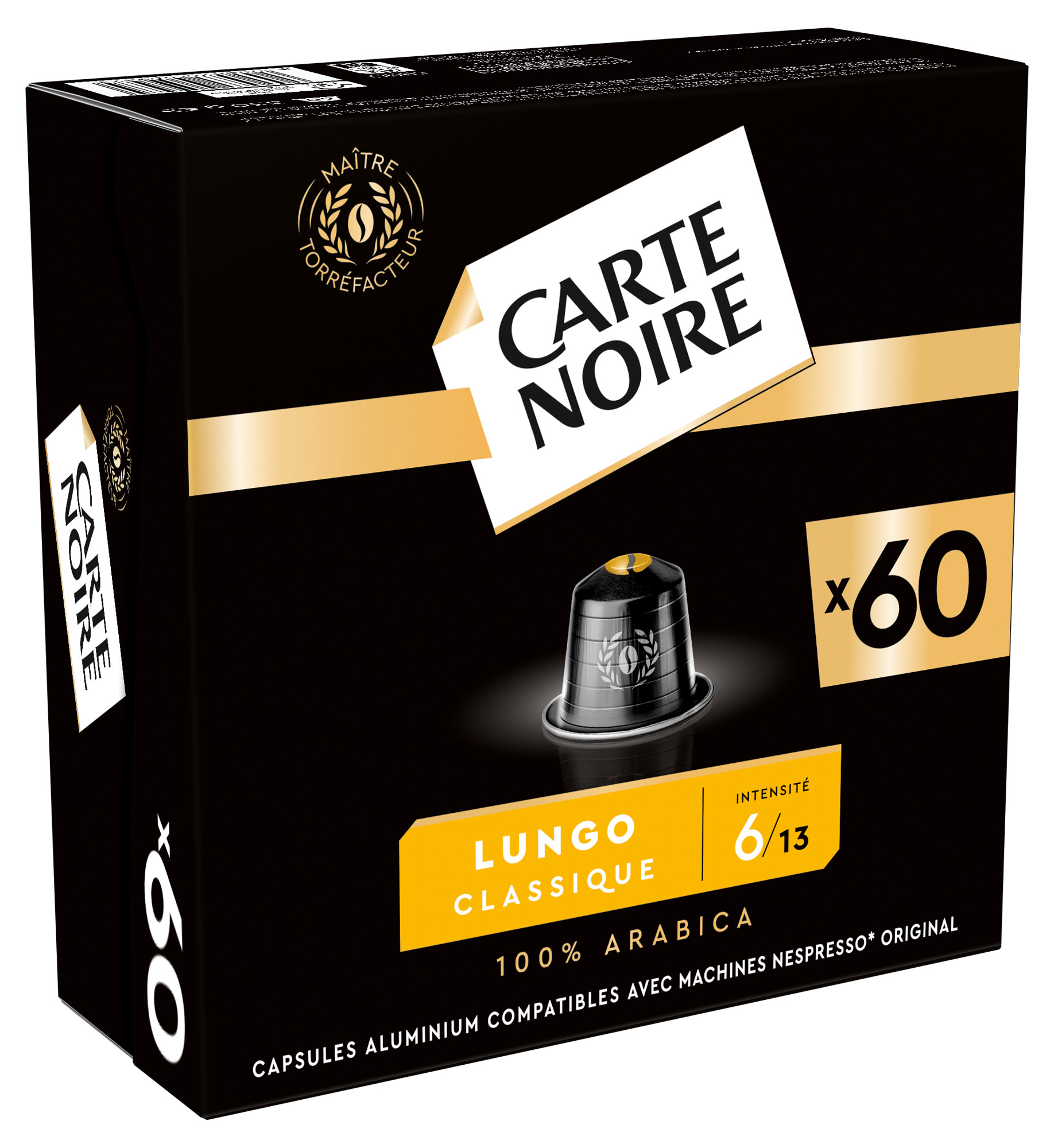 Description détailléeUn café au goût équilibré et aromatique.Pur arabica généreux, aux notes fleuries et caramélisées avec une fine acidité.Intensité N° 6Boîte de 60 capsules.Compatibles avec vos machines Nespresso®**Marque appartenant à un tiers n’ayant aucun lien avec CARTE NOIRE SAS.Compatibles avec toutes les machines à café à capsules commercialisées par Bruneau.