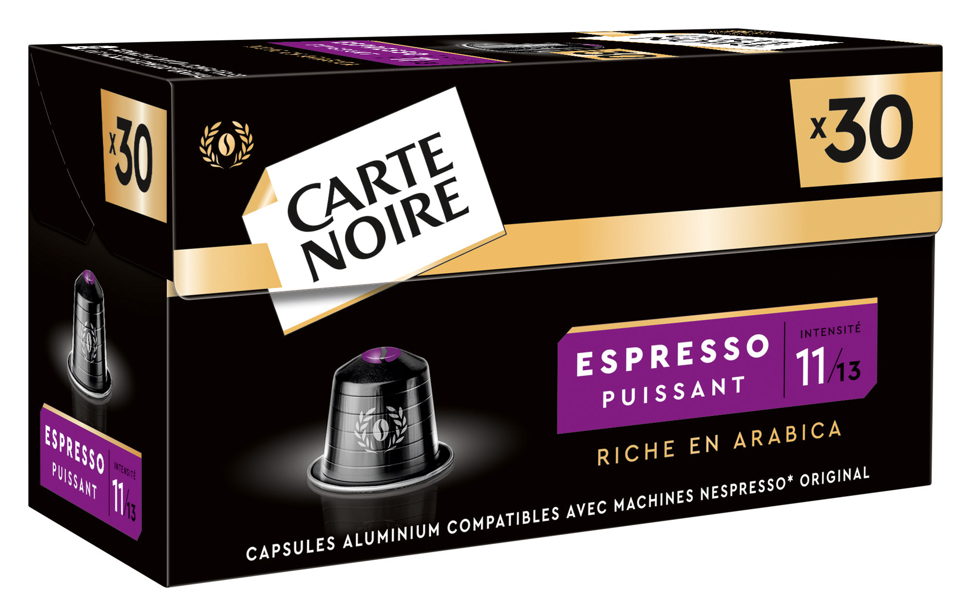 Description détailléeUn café profondément noir, dense et puissant, riche en arabica au goût profond et puissant.Notes délicieusement épicées et poivrées.Intensité N° 11Boîte de 30 capsules.Compatibles avec vos machines Nespresso®**Nespresso® est une marque d'un tiers n'ayant aucun lien avec CARTE NOIRE SAS.Compatibles avec toutes les machines à café à capsules commercialisées par Bruneau.