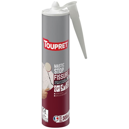 La cartouche Mastic stop fissure intérieur extérieur ton pierre de 300 g de coloris ton pierre de la marque TOUPRET est un mastic acrylique fissures façade intérieur/extérieur ton blanc. Extra souple. Evite les salissures et permet de réaliser des joints bois (portes, fenêtres).