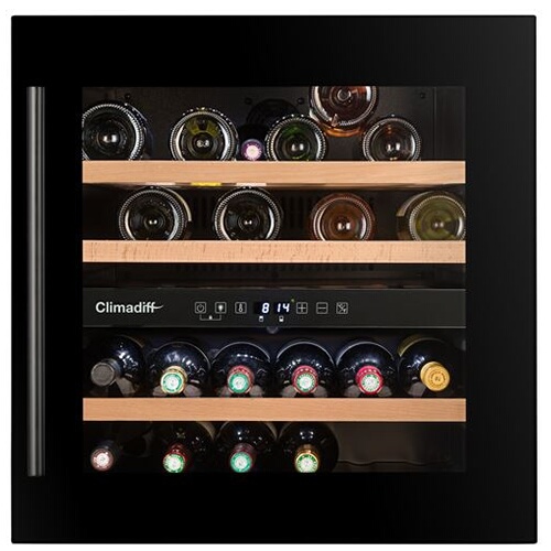 Encastrable - 36 bouteilles - HxLxP : 59 x 56,3 x 59,5 - Classe G – 37 dB, Deux zones - 3 clayettes, Porte vitrée anti-UV réversible - Cave connectée via une application Vinotag, Système anti-vibration - pieds réglables