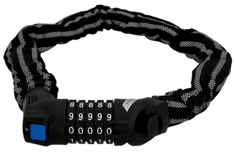 Description détailléeChaîne en acier de 8 mm d'épaisseur, avec revêtement en matériau 3M pour une meilleure visibilité dans le noir, cadenas à code de 5 chiffres pour 100.000 combinaisons
