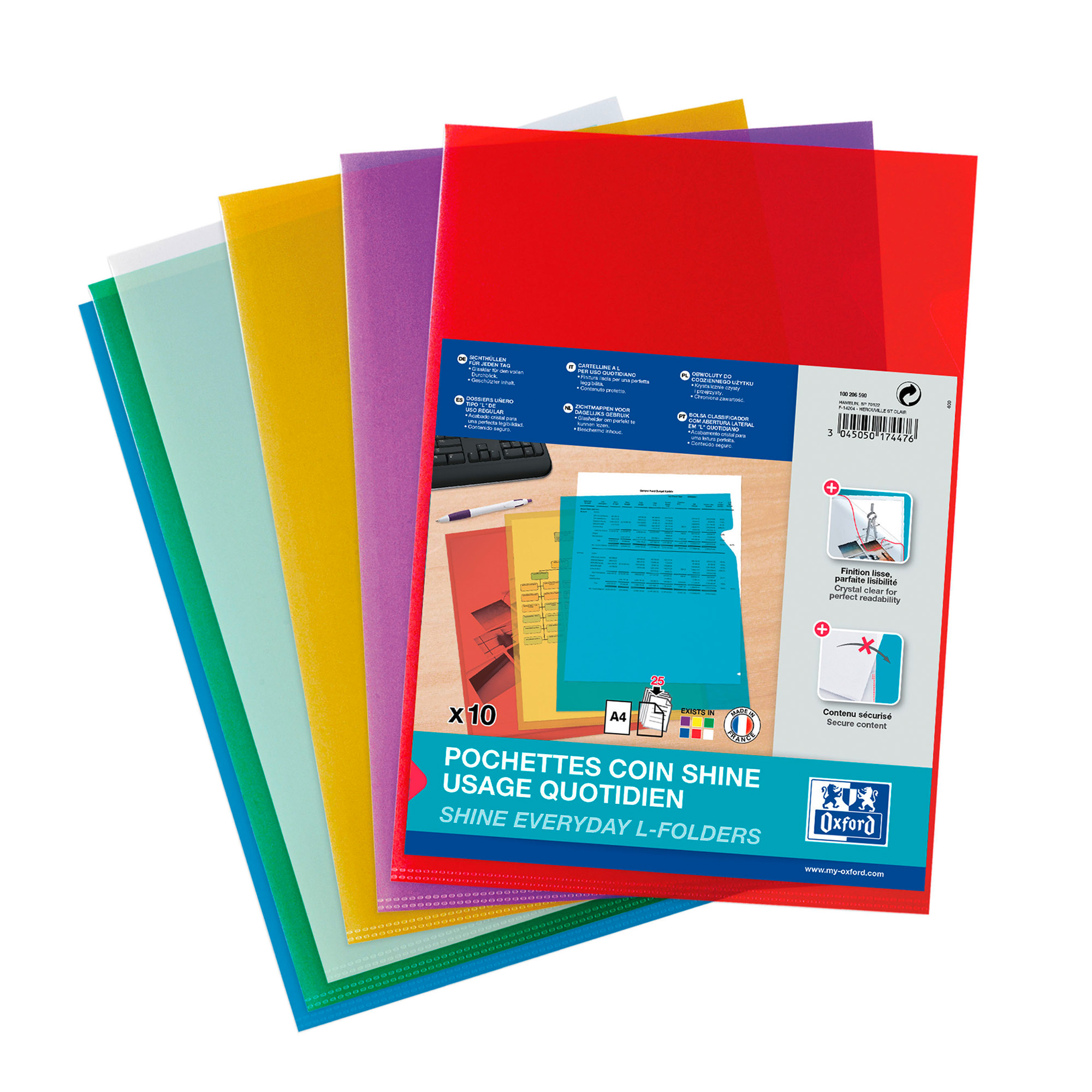 la chemise coin plastique, format 22 x 31 cm est vendue en assortiment (bleu, vert, incolore, jaune, violet, rouge) et à la couleur violet transparent.