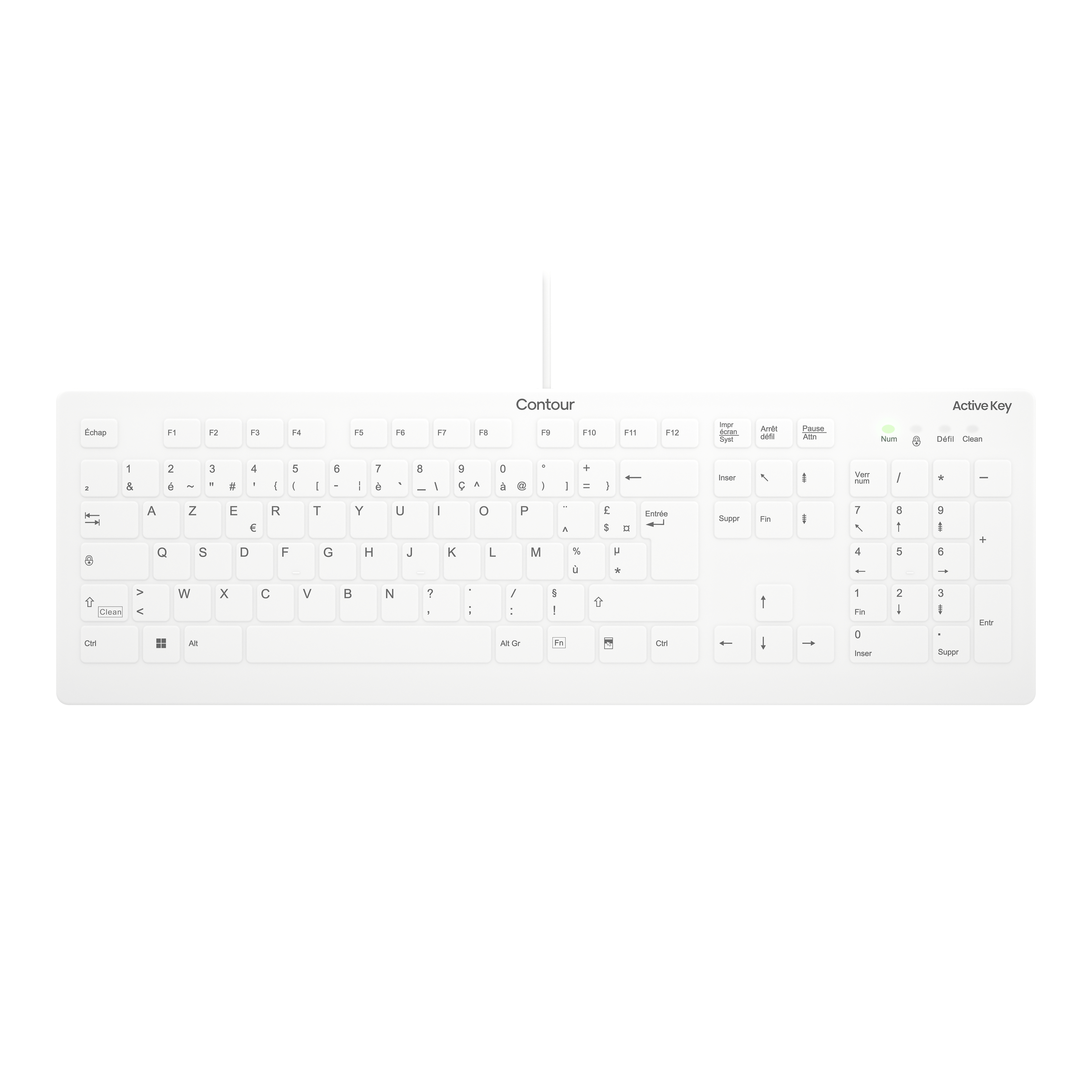 Contour Design Active Key AK-C8112. Facteur de forme du clavier: Taille réelle (100 %), Technologie de connectivité: Avec fil, Interface de l'appareil: USB, Interrupteur à clé de clavier: Commutateur de touche « ciseaux », Disposition des touches du clavier: AZERTY, Nombre de touches du clavier: 105. Longueur de câble: 1,8 m. Utilisation recommandée: Médical. Couleur du produit: Blanc