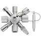 La clé universelle pour armoires de commande 10 profilés 2 croix 1 clé de chez Knipex sert pour toutes les armoires et systèmes de fermeture standard. Tous les systèmes de fermeture usuels. Clé multifonctionnelle pour l'actionnement des fermetures depuis les zones techniques des bâtiments (chauffage et sanitaire, technique de climatisation et de ventilation, électrotechnique), alimentation en gaz et en eau et systèmes d'arrêt. 2 clés reliées au moyen aimants pour économie d'espace. Embout réversible : fente 1,0 x 7 mm et empreinte cruciforme PH2. Clé et embout réversible accouplés par un fil métallique robuste en acier inoxydable. Construction en fonte de zinc sous pression optimisée en poids. Dimensions 92 x 85 x 23 mm. Attributs techniques : Capacité carré 5,0 / 6,0 — 7,0 / 8,0 — 9,0 / 10,0 — 11,0 mm. Capacité queue de pic 3 – 5 mm. Capacité d’ouverture de clé de demi-lune 6 mm. Capacité carré étagé 6 — 9 mm. Capacité triangle 7,0 — 8,0 / 9,0 — 10,0 / 11,0 — 12,0 mm.