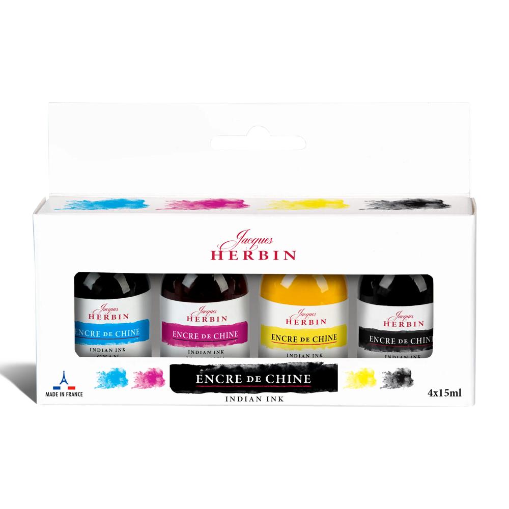 Ce coffret d'encre de Chine comprend les 3 couleurs primaires (jaune primaire, magenta, cyan) et le noir.