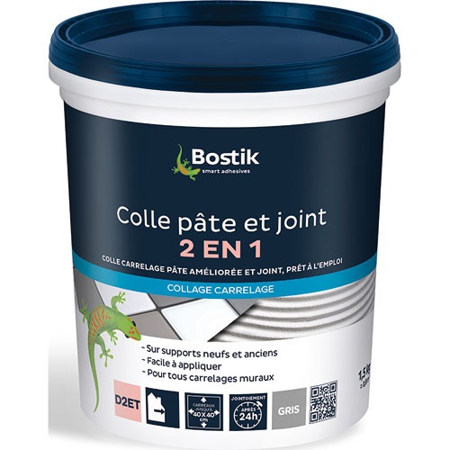 La colle et joint carrelage 2en1 de 1,5 Kg de la marque BOSTIK est une colle pour carrelage et un joint en pâte améliorée. Produit prêt à l'emploi, il est destiné aux carrelages muraux tels que la faïence, la céramique, les émaux, etc., sur tous supports, neufs ou anciens. Il permet de coller des carreaux d'une taille maximum de 40 x 40 cm. Adapté pour l'intérieur uniquement, sa formule 2 en 1 permet de coller les carreaux puis de réaliser des joints jusqu'à 4 mm sur les mur et plans de travail. Enfin, sa formule hydrofugée est adaptée pour une utilisation dans les pièces humides. Usage : intérieur, pièces sèches et humides. Utilisation : applicable sur supports neufs et anciens Jointoiement après 24h. Coloris : gris. Rendement : 2 à 3 Kg/m² en simple encollage.