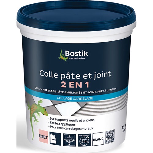 La colle pâte et joint 2 en 1 de coloris blanc de 1,5 Kg de la marque BOSTIK pour carrelage permettant de coller les carreaux jusqu'à 30x40 cm et de réaliser les joints de 1 à 6 mm sur les murs et plans de travail intérieurs. Grâce à sa formule hydrofugée, elle est idéale pour vos pièces humides (cuisine et salle de bains). Pour tous types de carrelages muraux (faïences, carreaux de céramique, émaux). A utiliser sur : plaques de plâtre cartonnées, carreaux de plâtre hydrofugés, enduit de ciment ou de plâtre, ancien carrelage poncé, béton cellulaire. Prêt à l’emploi.