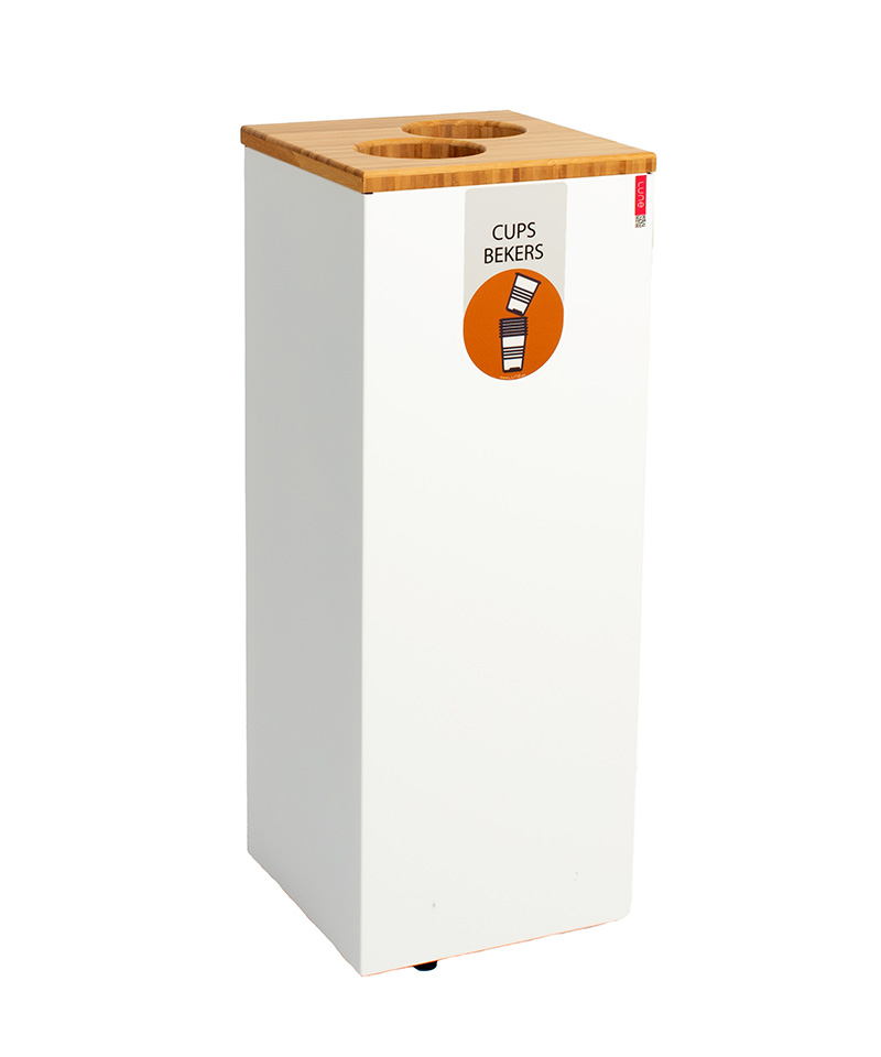 Station de collecte pour gobelets en acier galvanisé avec un couvercle élégant et durable en bambou. Le couvercle est équipé de 2 ouvertures (Ø 9,5 cm) avec étiquettes d'indication. La station comprend 2 tubes de collecte pour empiler les gobelets. Ceci permet de collecter 2 x plus de gobelets. Facile à vider. Modulaire et connectable. Les éléments étant connectés au moyen d'aimants, les poubelles peuvent être attachés dans le sens de la longueur mais également en carré ou rectangle. Ceci rend le Paxa très flexible et une solution idéale pour le tri des déchets à n’importe quel endroit. Livraison uniquement au rez de chaussée.
