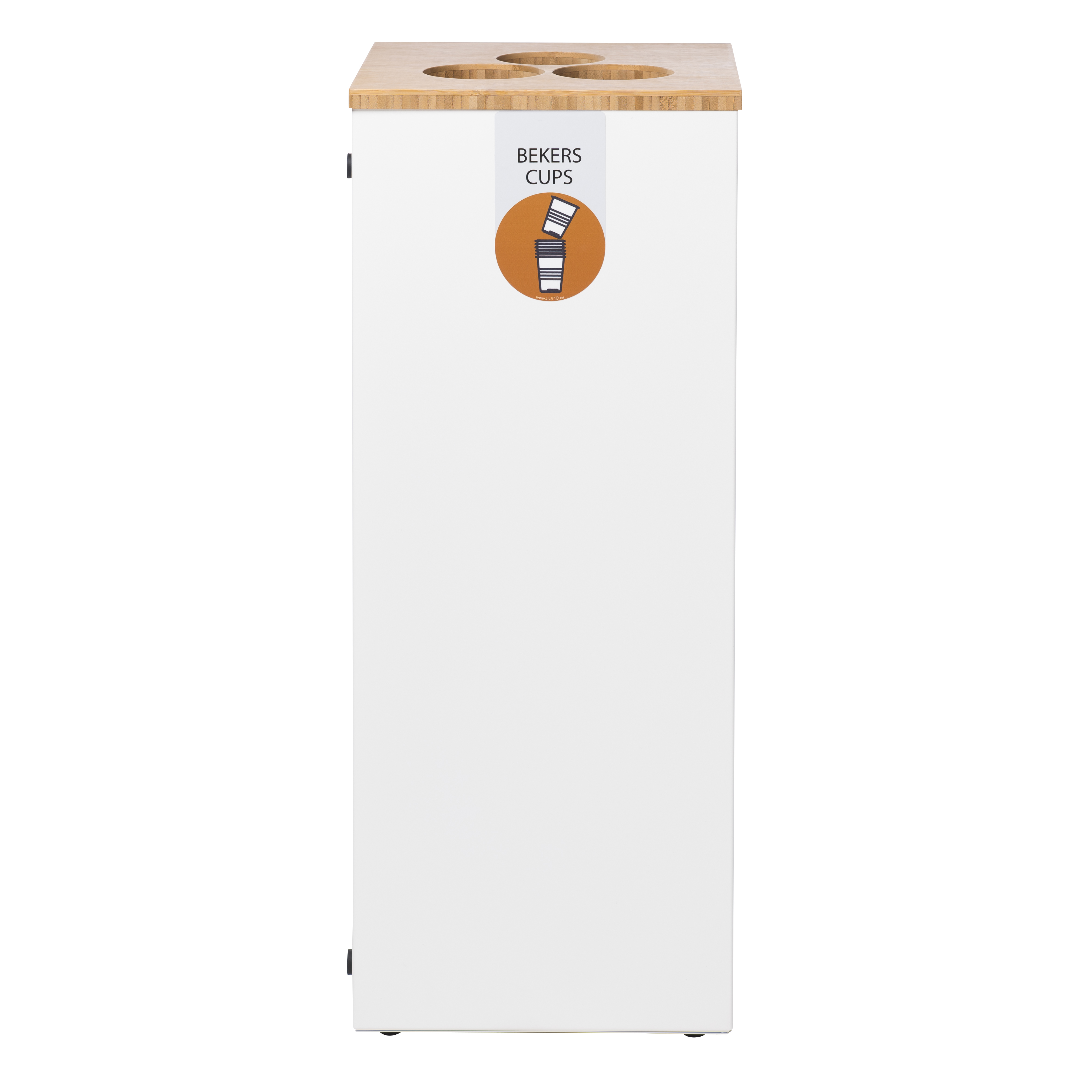Station de collecte pour gobelets en acier galvanisé avec un couvercle élégant et durable en bambou. Le couvercle est équipé de 3 ouvertures (Ø 9,5 cm) avec étiquettes d'indication. La station comprend 3 tubes de collecte pour empiler les gobelets. Ceci permet de collecter 3 x plus de gobelets. Facile à vider. Modulaire et connectable. Les éléments étant connectés au moyen d'aimants, les poubelles peuvent être attachés dans le sens de la longueur mais également en carré ou rectangle. Ceci rend le Paxa très flexible et une solution idéale pour le tri des déchets à n’importe quel endroit. Livraison uniquement au rez de chaussée.