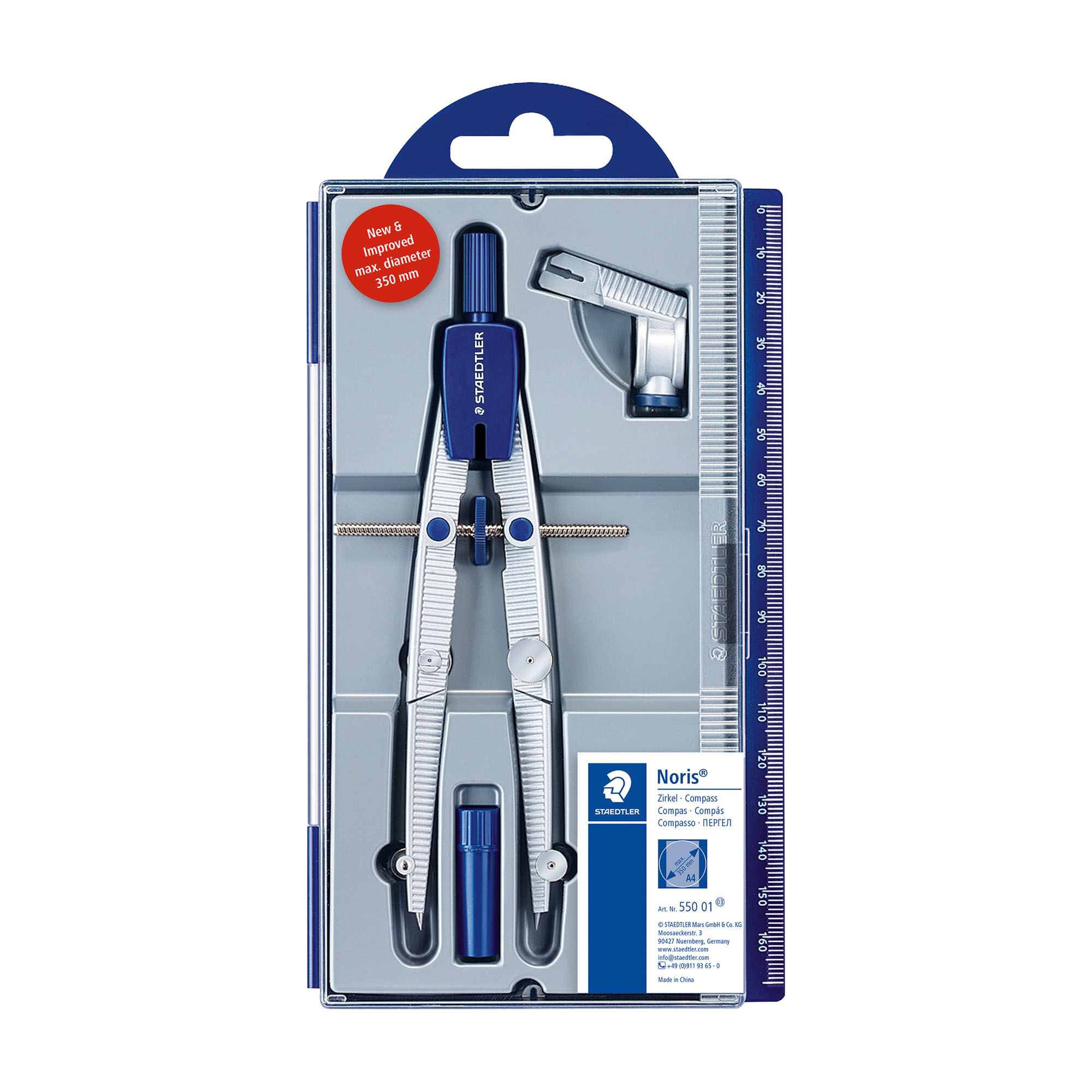 Explorez le monde de la précision avec le compas scolaire Noris 550 01 de la marque renommée Staedtler. D'une longueur de 156 mm, ce compas allie fonctionnalité et élégance grâce à son design bicolore bleu et argent.