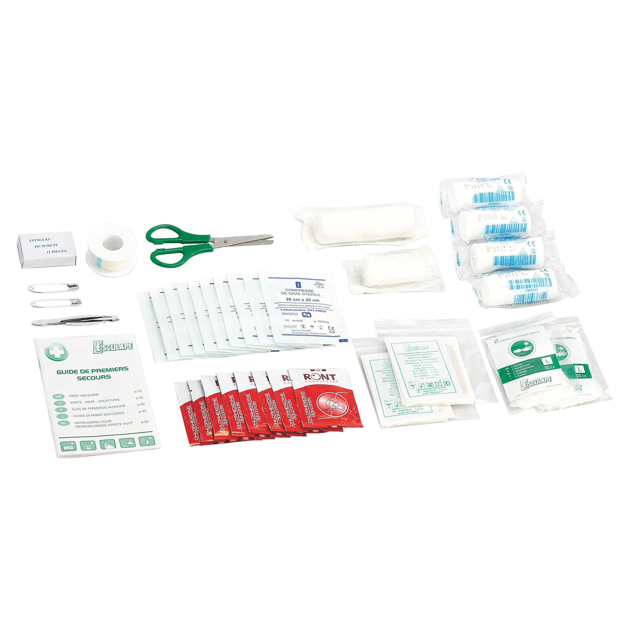 Pour plus d'hygiène et de praticité, il comprend aussi : 1 paire de ciseaux, 1 pince à échardes, 12 épingles de sûreté et 2 paires de gants vinyle. Le tout est accompagné d'une notice de premiers secours pour connaître facilement les gestes à appliquer