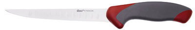 Le design élégant en rouge et gris du couteau de cuisine 'Titanium' ajoutera une touche de modernité à votre cuisine professionnelle. La poignée ergonomique est spécialement conçue pour un confort d'utilisation maximal, permettant une prise en main sûre et précise pour toutes les tâches de découpe.