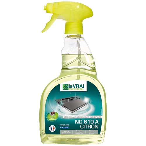Dégraissant désinfectant alimentaire ND 610 A 750 mL Parfum "Citron" - Nettoie, dégraisse et désinfecte les surfaces, notamment en milieu alimentaire - Entretien et fait briller les inox - Idéal pour les professionnels de la restauration, de l'entretien des cuisines centrales, cafétérias..., c'est un dégraissant désinfectant bactéricide et actif sur sur Salmonelle et Listéria pour l'hygiène professionnelle - Sa formulation est sans Javel, sans ammonium quaternaire, sans danger pour les fosses septiques (usage préconisé pour les siphons), sans risque de taches sur vêtements ou revêtements - Prêt à l'emploi - Activité bactéricide selon la norme NF EN 1276 à 20° en 5 minutes - Actif sur Salmonelle et Listéria - Sans impact sur les fosses septiques si respects des recommandations - Apte au contact alimentaire après rinçage à l'eau potable - Aspect liquide - Couleur Jaune - Parfum Citron - Spray 750 mL - Fabriqué en France.