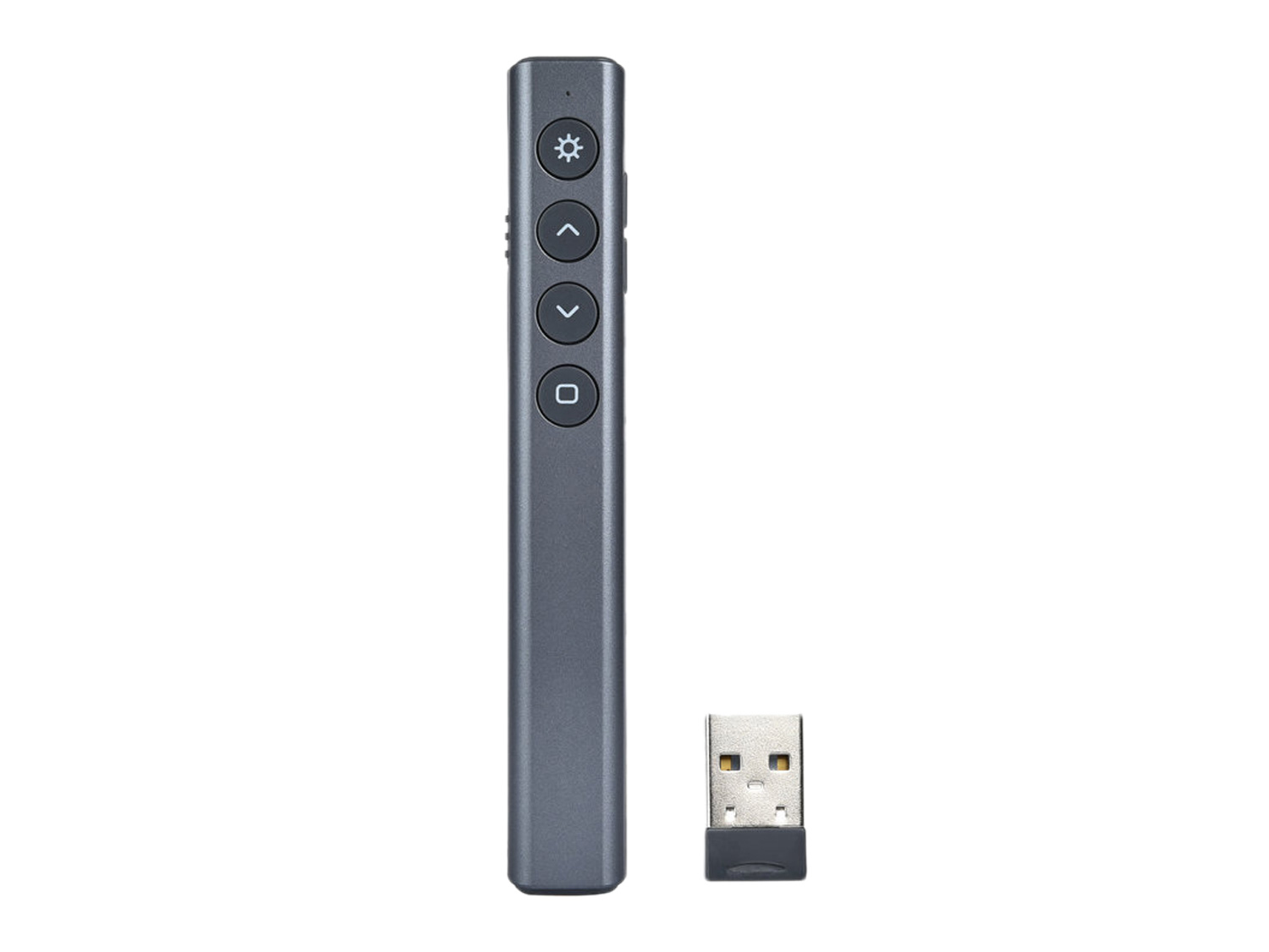 Description détailléeTélécommande de présentation avec pointeur laser rouge - Fonctions : page précédente/suivante, lecture/pause, volume - Bouton ON/OFF - Distance de contrôle 10m - Fourni avec récepteur sans fil USB-A et pile AAA