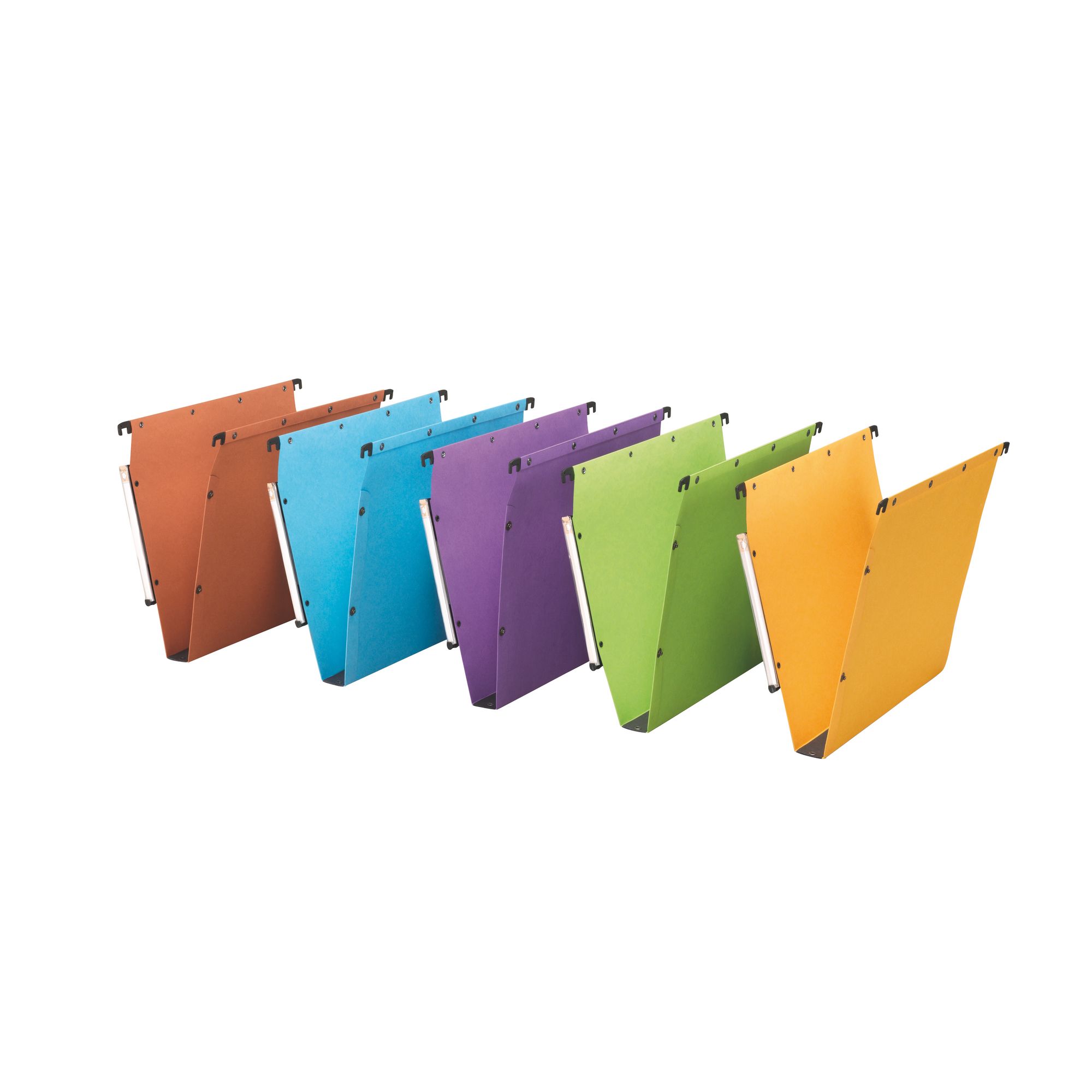 Pour armoires. Grand porte-étiquette largeur 9 mm à effet loupe (étiquettes fournies). Tringle de suspension en acier indéformable, spécial dossiers lourds. Embouts plastique surmoulés indissociables. Fixation par rivets métal anti-déchirure. Système de mise en continu par bouton pression. Carte orange 240 g renforcée, ultra-résistante.