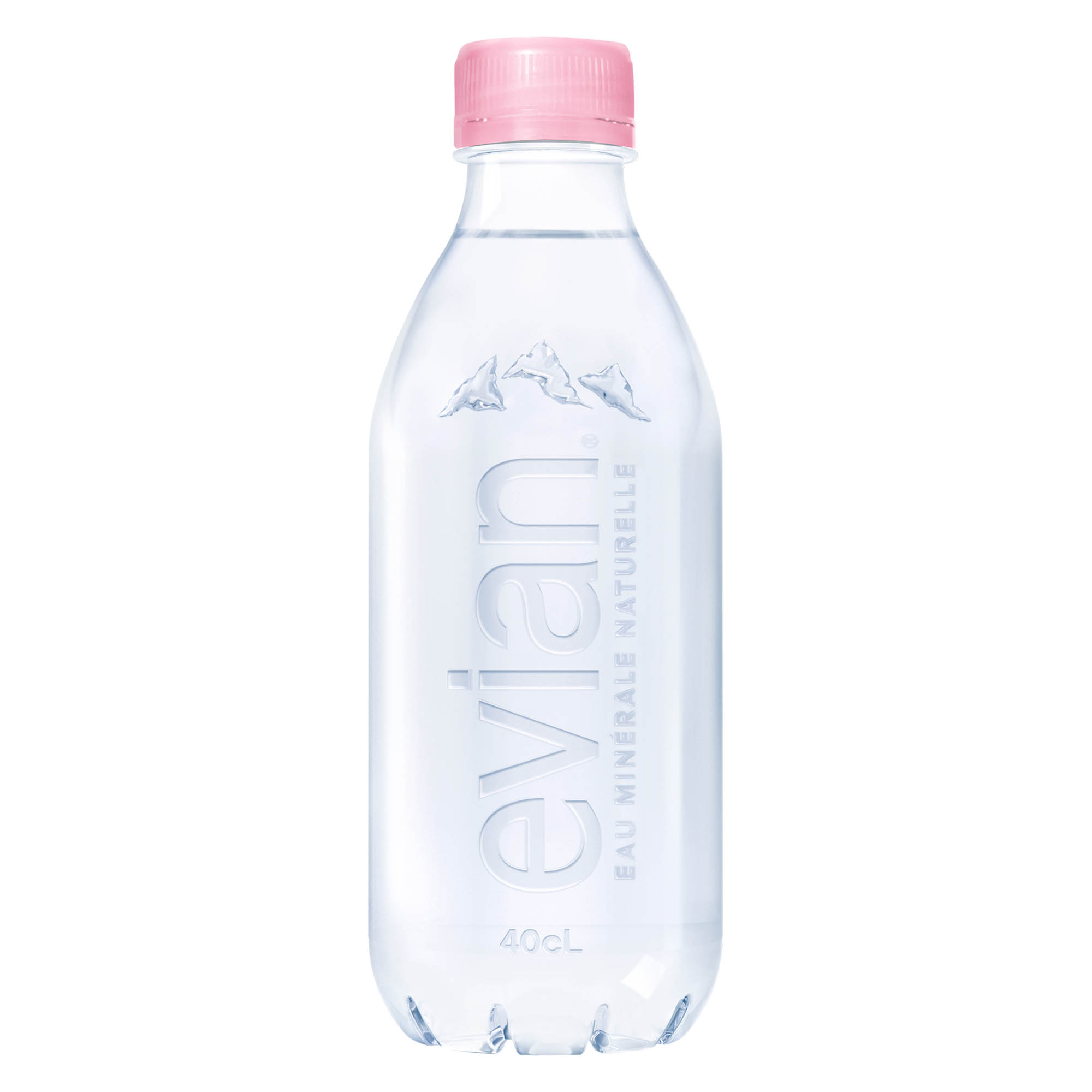 Eau minérale plate Evian. Née au cœur des Alpes, d'une source protégée, l'eau est pure et 100 % naturelle.
