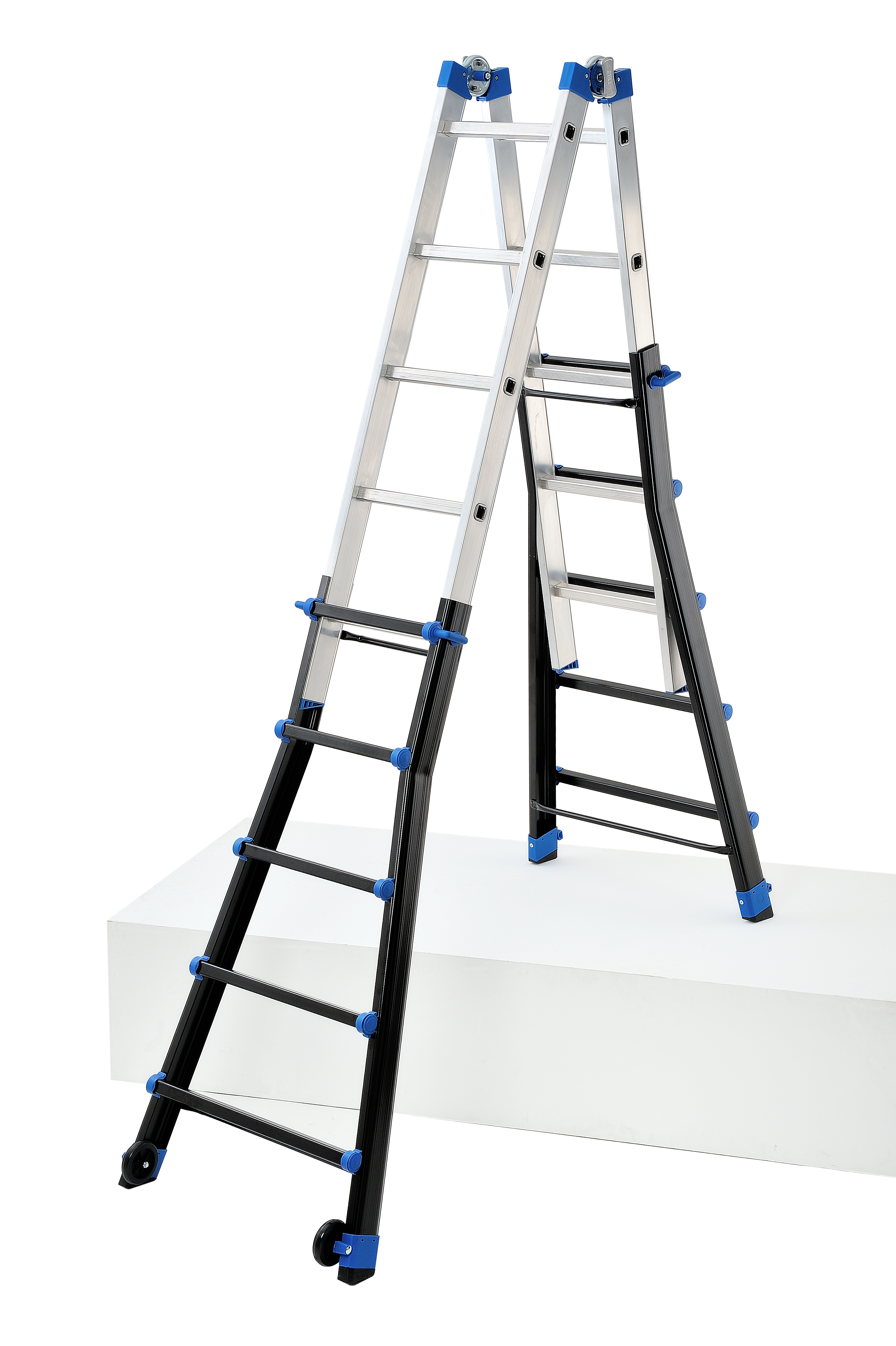 Description détailléeEchelle multifonction extensible. Verrouillage de l'articulation renforcée et automatique. Roulettes de déplacement.