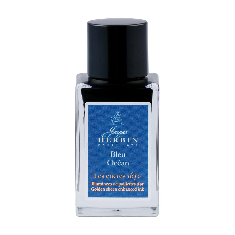 L'encre Bleu Océan, de couleur soutenue et profonde, est majestueuse en raison de ses paillettes dorées qui étincellent de mille feux. Elle est un hommage à la couleur de la mer chère au navigateur Herbin lors de ses différents voyages.