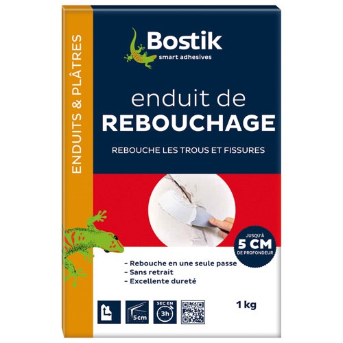 Description détailléeL'enduit de rebouchage en poudre 1 Kg de la marque BOSTIK rebouche les trous et fissures jusqu'à 5cm en une seule passe sans creuser ni fissurer.