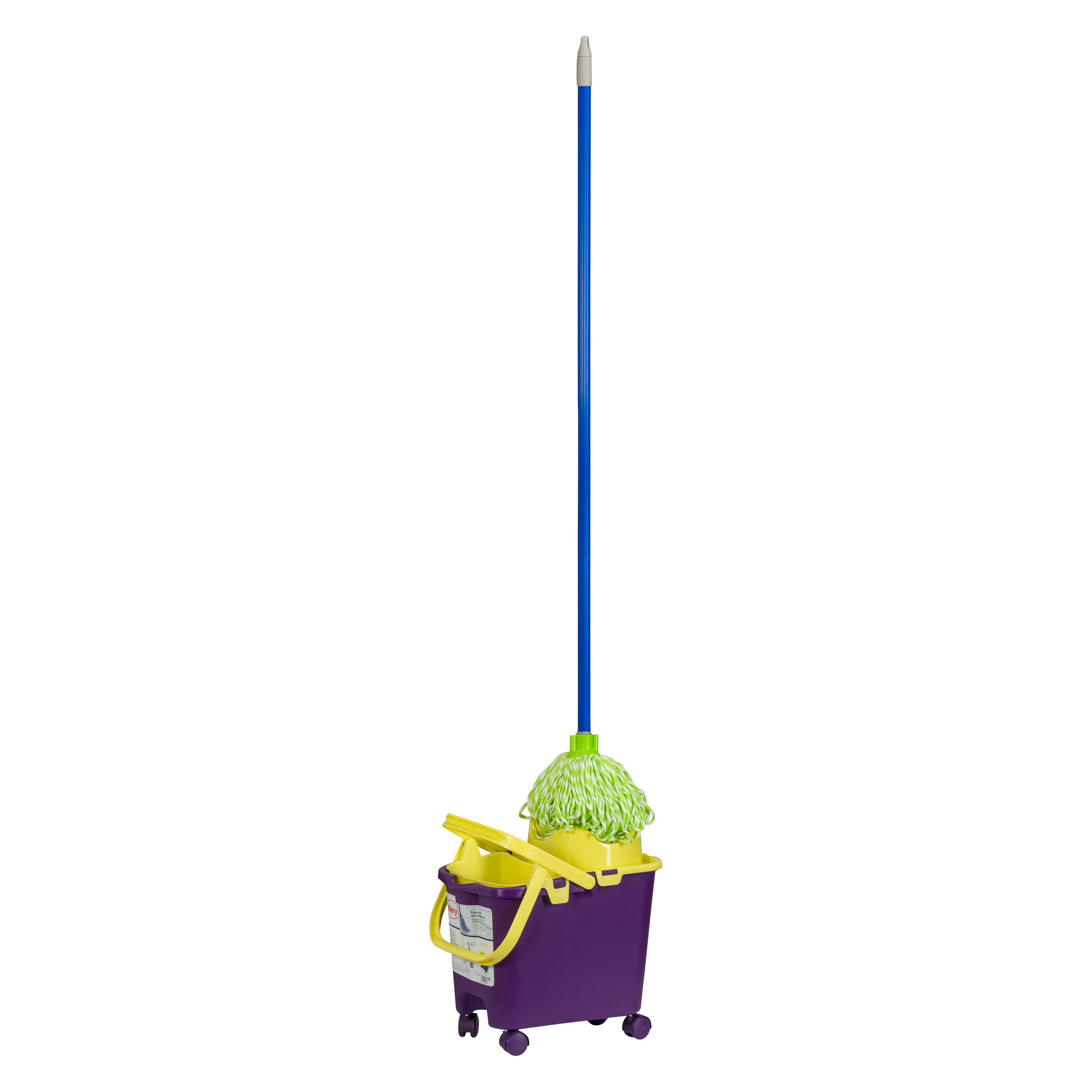 d'un seau de 14 L (+3 L avec essoreur). Pour faciliter les déplacements, le seau est muni de 4 roues multidirectionnelles. Dimensions : P 38 x L 24 x H 31 cm,