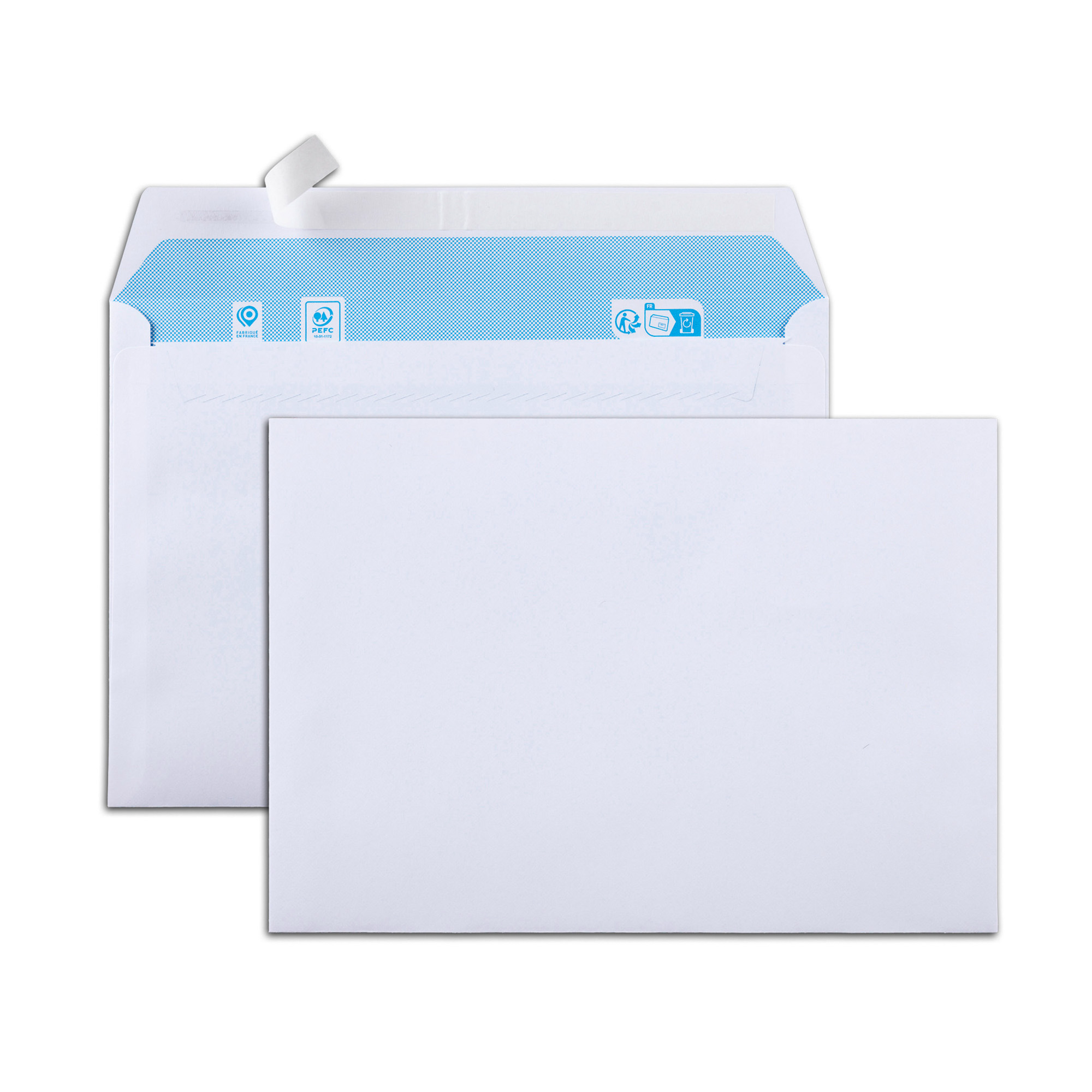 Papier 80 g. Fermeture par patte autocollante avec bande protectrice.