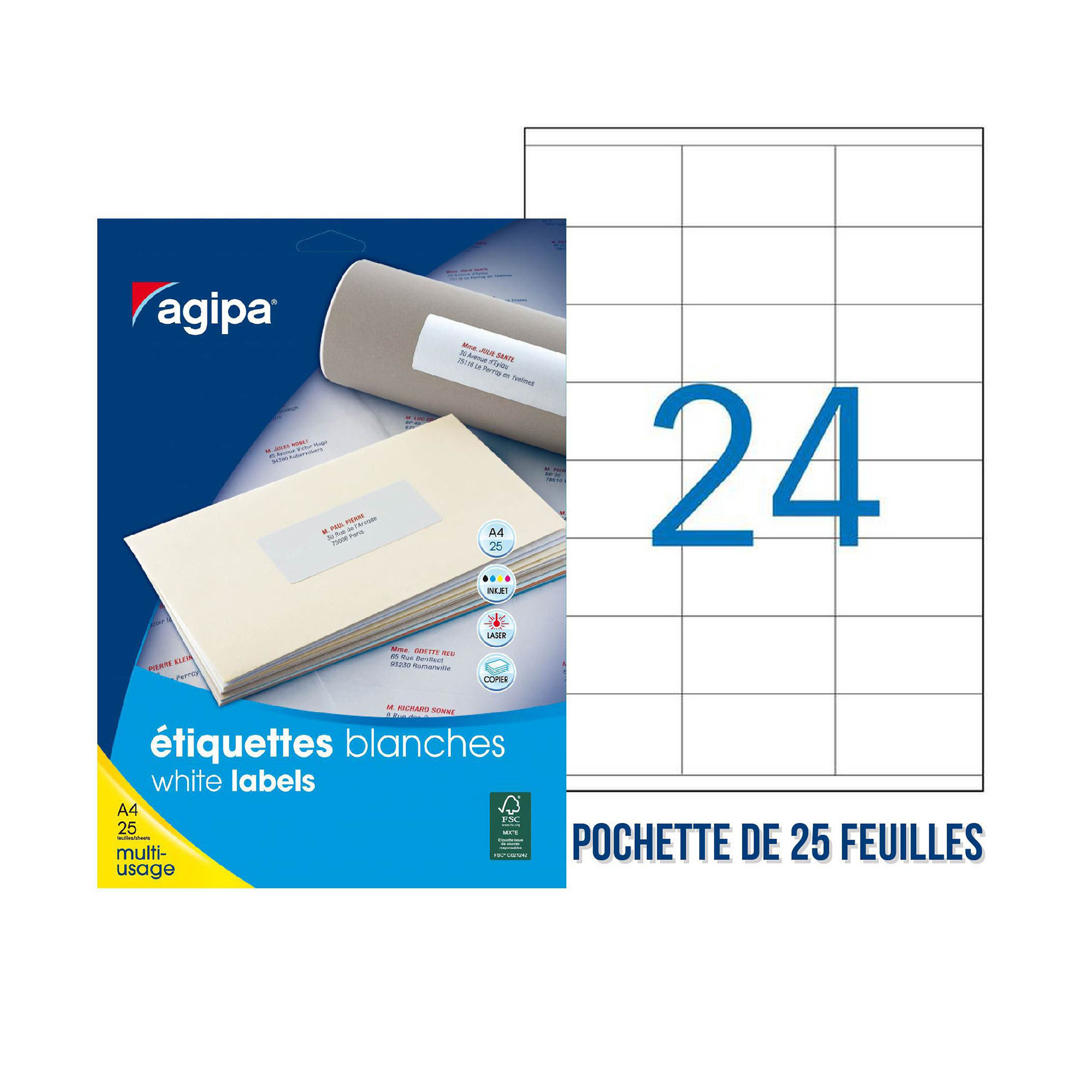 Boîte de 25 feuilles A4 avec 24 étiquettes chacune, ce qui vous fait un total de 600 étiquettes