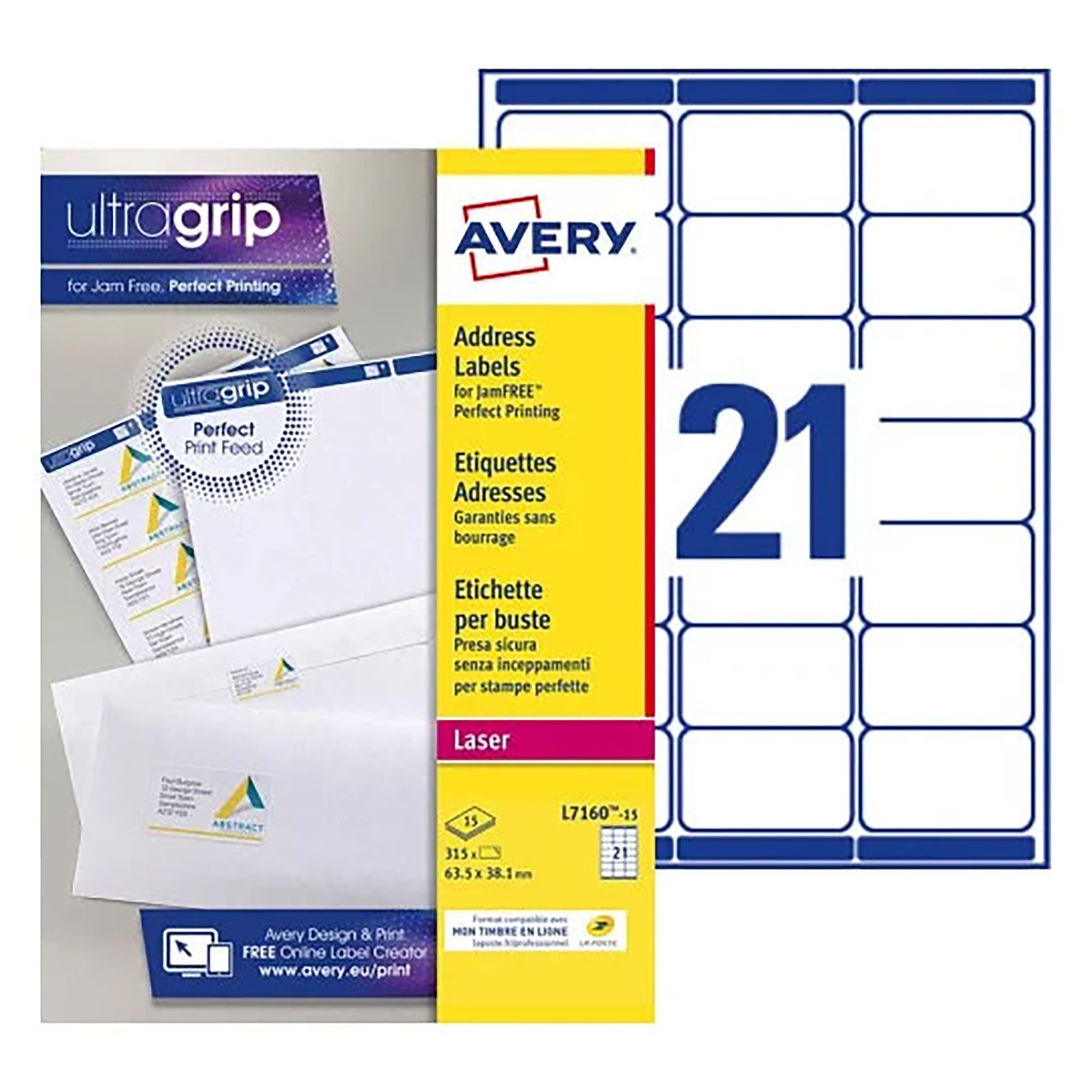 Les étiquettes adressage blanche Avery L7160-15 sont idéales pour imprimer les coordonnées de votre destinataire sur vos envois. Elles sont facilement détachables pour un gain de temps sur du publipostage. Avery met à votre disposition toute une gamme d’étiquettes pour vous aider dans toutes vos tâches quotidiennes : adressage, classement, organisation, et plus encore !