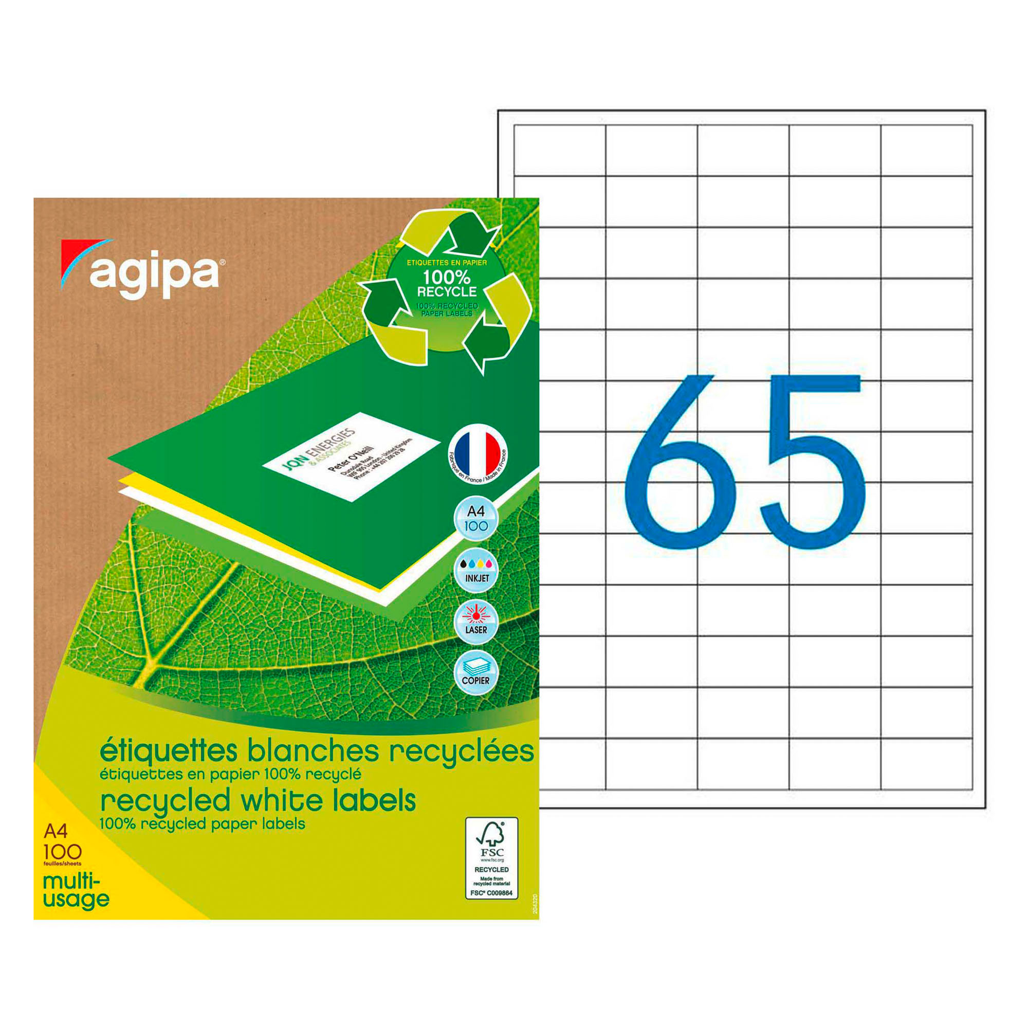 boîte de 100 feuilles de 65 étiquettes soit un total de 6500 étiquettes