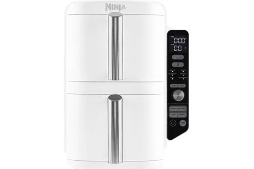 Cuisson avec peu d’huile - Capacité 9.5 L : 1.4kg de frites, Technologie Dual Zone - 2 tiroirs de cuisson indépendants, 6 modes de cuisson : Max Crisp, Air Fry, Rôtir, Cuire, Réchaufffer, Déshydrater, Température réglable de 40°C à 240°C - Revêtement antiadhérent