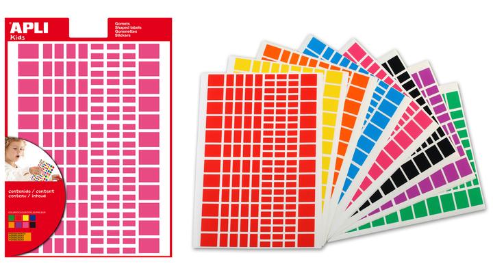 Sachet de 18 feuilles composé de 144 gommettes rectangulaires par feuille, soit un total de 2592 gommettes à adhésif permanent.